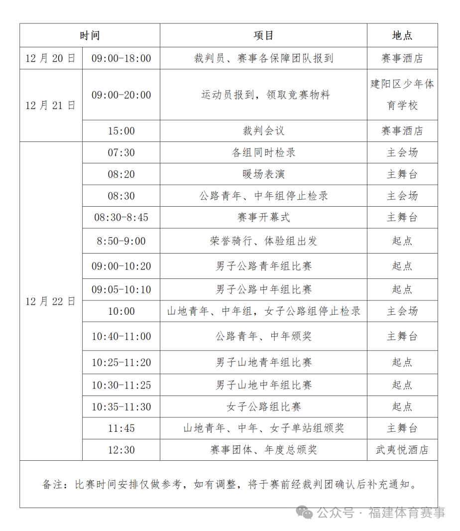 注:經公安交警部門與組委會溝通,體驗組的騎行終點調整至南平市政府前市民廣場,賽事紀念牌將在終點發放。騎行結束后,參加車友自行解散。推薦前往崇陽溪漫步道騎游,感受不一樣的建陽風光。 (三)競賽日程安排 因考慮到賽事當天氣溫較低,經組委會研究決定,賽事整體時間推遲一個小時,賽事所有組別賽程減少一圈,即7:30分開始檢錄。請各參賽選手注意檢錄及發車時間。 m