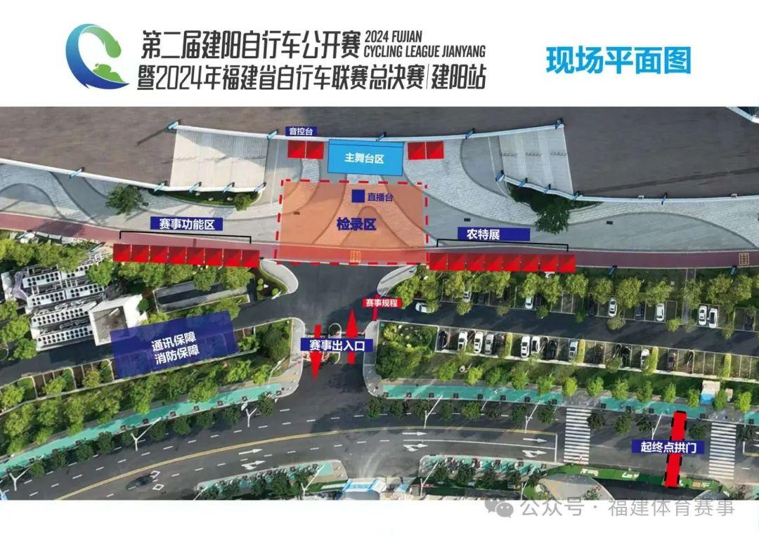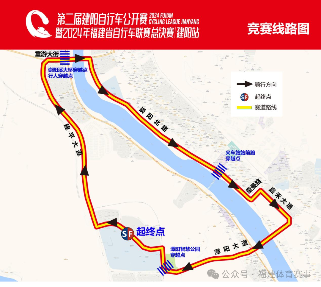 二、簽到安排(所有組別) (一)簽到時間 2024年12月21日9:00-20:00 (二)簽到地點 建陽體育館 (三)簽到流程 出示身份證明 ↓ 簽署《免責聲明》 ↓ 領取參賽包 三、檢錄 (一)開始檢錄時間 所有組別開始檢錄時間:7:30 (二)結束檢錄時間 男子公路青年組、男子公路中年組檢錄結束時間為8:30。 男子山地青年組、男子山地中年組、女子公路組檢錄結束時間為10:00. (三)注意事項 參賽運動員檢錄需要攜帶并出示本人身份證明 四、聯賽總成績補充說明 (一)年度團隊獎 即將各隊在各分站所得團體積分相累加來計算,得分高者名次在前,若積分相等;則按照各隊在最后一站(總決賽)的個人名次先后來決定。 (二)公路青年年度個人總冠軍獎 將各站個人成績獲得的積分相累加來計算排名,積分高的名次在前,若成績相等;則按照最后一站(總決賽)的個人名次先后來決定。 (三)公路青年年度途中沖刺王獎 將各分站途中沖刺所得積分累計相加錄取分數高的前3名,若積分相等;則按照最后一站途中沖刺的分數來決定,如果再相等,就以最后一站(總決賽)的最后終點沖刺的名次來決定。 交通管制通知 2024年12月22日,福建省自行車聯賽(建陽站)將在建陽城區舉行,為了確保自行車聯賽的順利舉辦,按照相關法律法規規定,決定在自行車聯賽期間對部分路段采取交通管制措施,具體通告如下: 一、騎行路線 榮譽騎游線路:南平市體育中心北門——體育路——建平大道——大紅袍路——云谷大道——南林大街——市民廣場——崇陽溪漫游道。