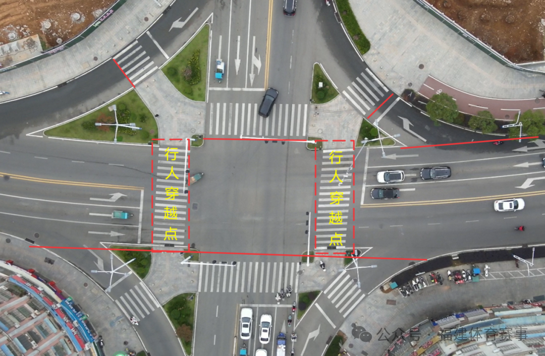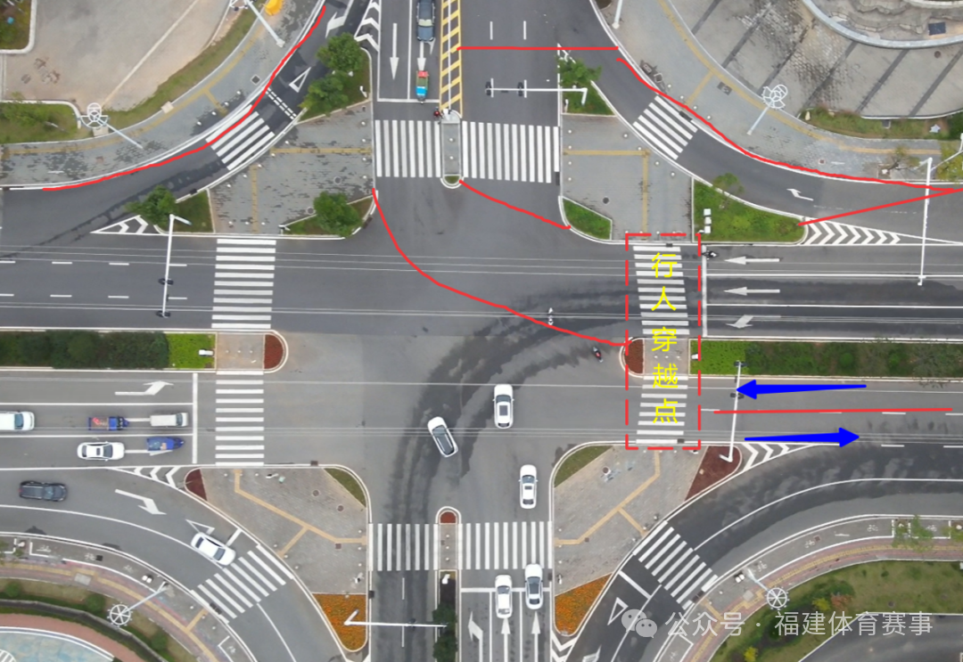 4、潭山大道潭陽大道行人穿越點:統一聽從現場賽事裁判指揮,有序通過斑馬線,如下圖