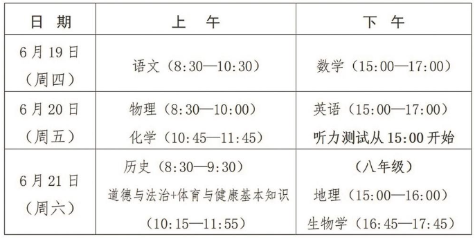 東南網(wǎng)1月7日訊(福建日報(bào)記者 蔣豐蔓) 福建省教育考試院6日發(fā)布2025年中考省級統(tǒng)一考試科目和時(shí)間安排。 我省初中學(xué)業(yè)水平考試(以下簡稱“中考”)的語文、數(shù)學(xué)、英語、道德與法治、歷史、地理、物理、化學(xué)、生物學(xué)等9個(gè)科目及體育與健康基本知識考試實(shí)行省級統(tǒng)一考試,全部實(shí)行書面閉卷筆試形式。其中,道德與法治和體育與健康基本知識考試同場合卷進(jìn)行。 根據(jù)通知,2025年中考省級統(tǒng)一考試安排在6月19日至21日舉行(具體科目考試時(shí)間安排見上表)。 此外,2025年我省中考具體報(bào)名辦法由各設(shè)區(qū)市制定,各地將于3月31日前完成中考報(bào)名工作。 |