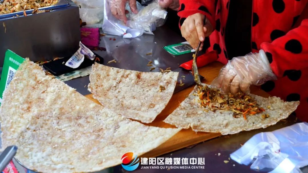市民葉志福:“今天買了兩只板鴨,兩只板鴨是140塊,它滿100塊就可以優惠,我就把那個優惠券拿去優惠,我就省了15塊,15塊我就把膨糕稱一斤回去了,拿回去過年。因為這個政府組織的,大家都比較放心?!?/span> 活動當天恰逢建陽傳統圩日,光餅、鍋邊、鍋巴等特色小吃也紛紛出攤,大家一邊采買年貨,一邊品嘗各色美食。琳瑯滿目的商品、濃濃的煙火氣息,成就了年集的獨特魅力。