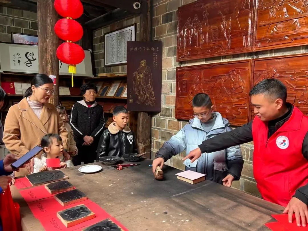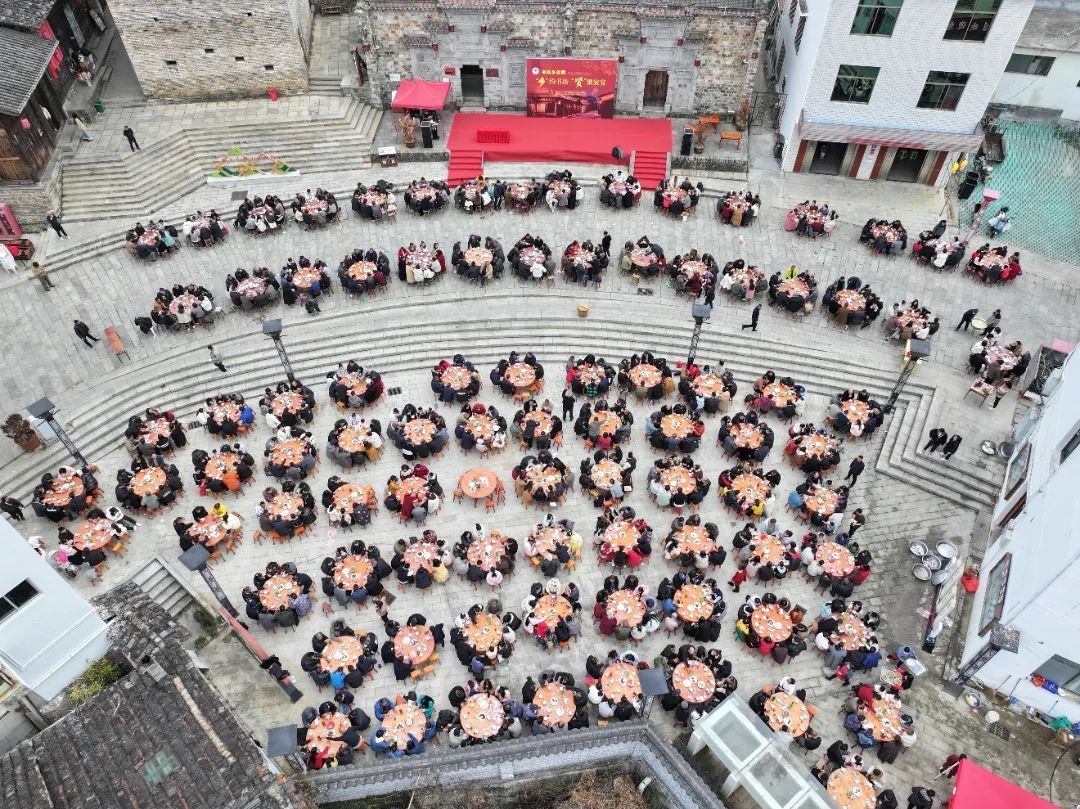 在康寧古街,建本雕版印刷體驗、義寫春聯、趣味套圈、特色小吃,吸引鄉賢、游客們“游古街,集五福”游園打卡。除了文化展示、趣味互動外,百余張大圓桌擺滿了整個康寧古街文化廣場,來自五湖四海的賓朋們圍坐在一起共享充滿深厚文化內涵和美好寓意的“三色”家宴。