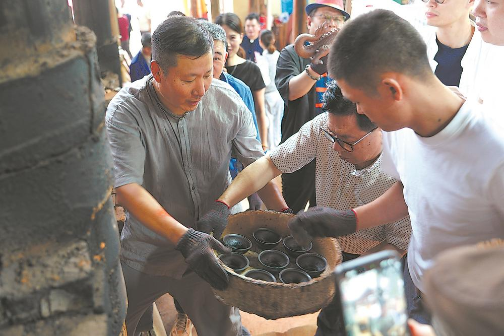 建盞出窯 蔡沁妍 攝 歷經明滅 窯火不熄 建窯遺址位于今南平市建陽區水吉鎮的后井村、池中村一帶,呈環狀分布,總面積約12萬平方米,10條窯爐多依山而建,形如巨龍斜臥,故名龍窯。其中,大路后門窯址3號窯爐長135.6米,單次可裝燒10萬件以上器物,雄踞國內龍窯之首。 建窯創燒于晚唐五代時期,初期規模不大,主產青釉、醬釉瓷。步入宋代,建窯蓬勃興盛,窯火熊熊。北宋初期,赫赫有名的黑釉碗盞——“建盞”問世。 “作為建窯的代表性產品,建盞口大足小,形似漏斗,以束口盞最具特色。其風格質樸穩重,造型飽滿剛健,富有優美的曲線變化,是福建地區陶瓷生產悠久歷史與精湛工藝的象征。”南平市建陽區建盞文化產業研究發展中心副主任陳艷說。