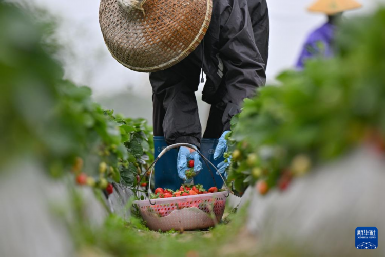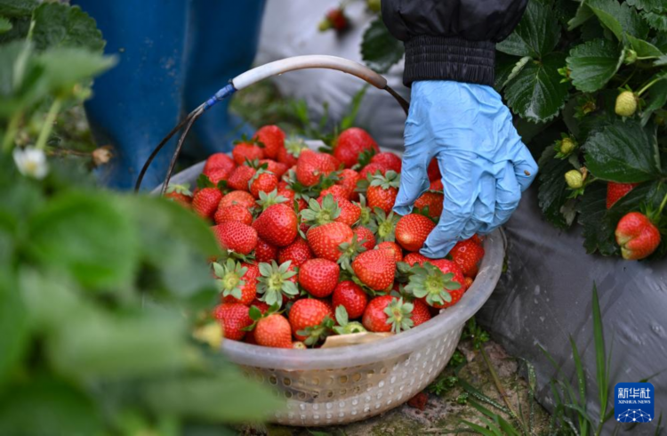 2月23日,海南省儋州市東成鎮平地村的農民在采收草莓。 早春時節,海南的農民不負農時,忙著播種與收獲,田間地頭一派農忙景象。 新華社記者 郭程 攝
