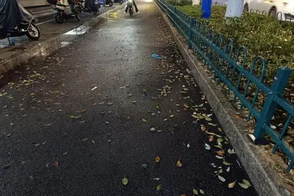 地面落葉清理前、后 因落葉、泥沙、渣土淤積堵塞,造成積水嚴重的路段,環衛工人開啟“手動清理”模式,一次次地彎腰、起身,將積水推向排水口,用雙手為市民開辟出一條條干爽的道路。