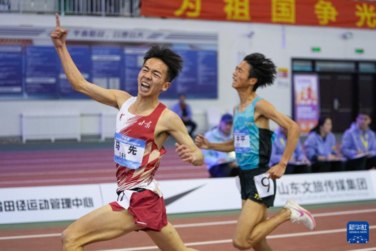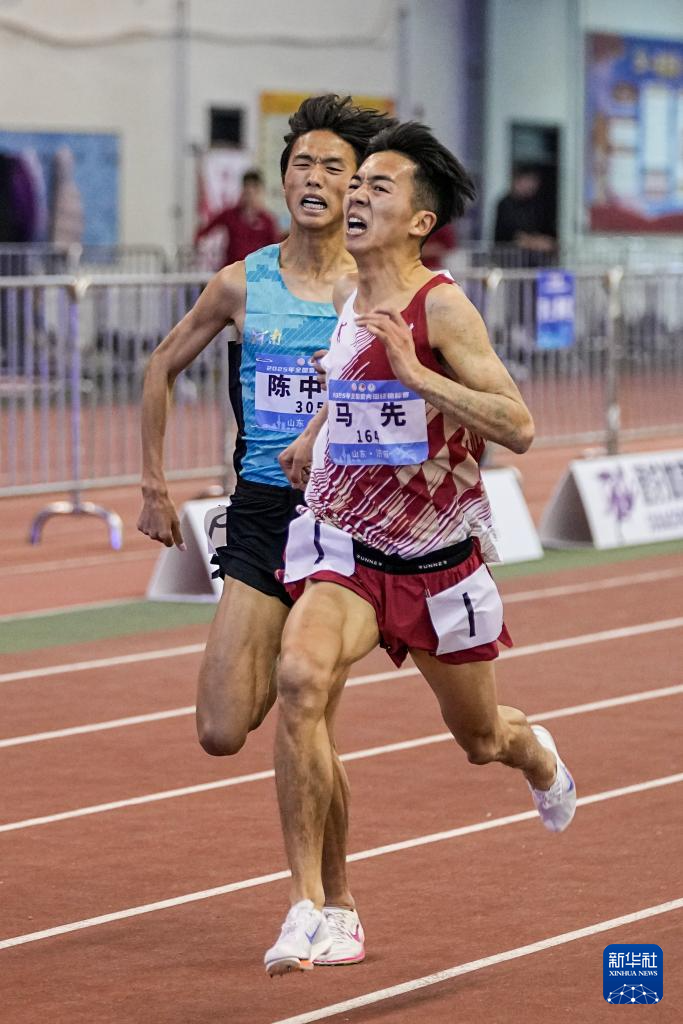 3月9日,甘肅隊選手馬先(左)在男子3000米決賽中。他以8分12秒33的成績獲得冠軍。 當日,2025年全國室內田徑錦標賽在山東濟南落幕。 新華社記者 朱崢 攝