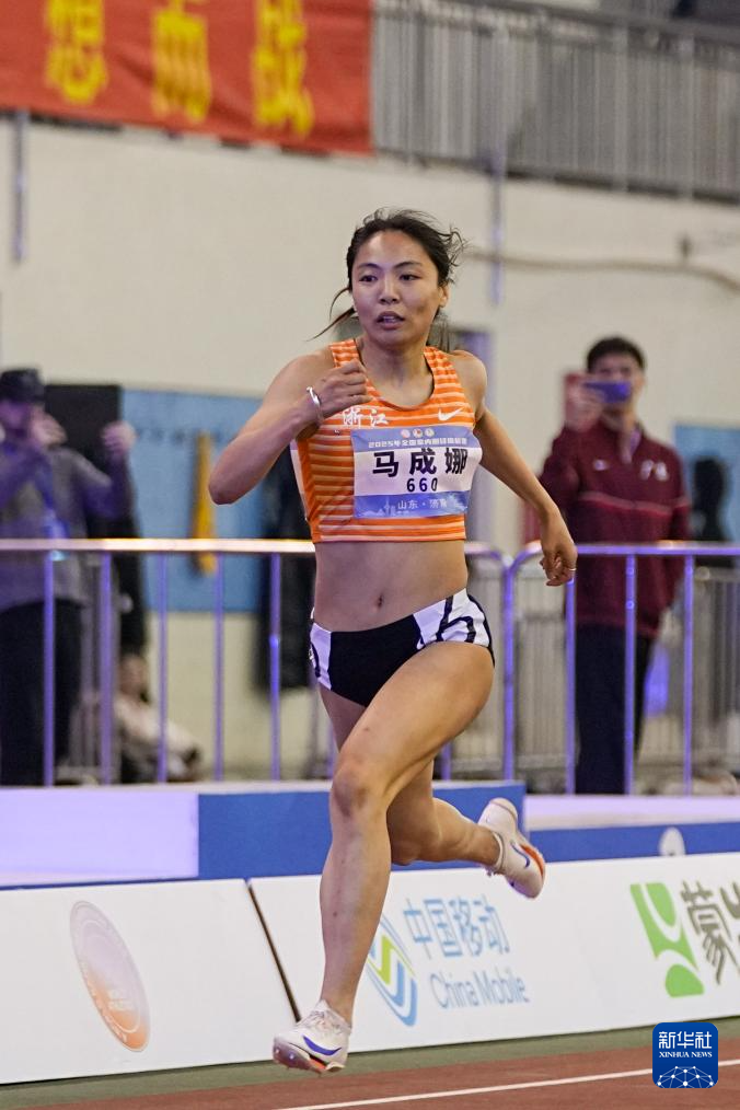 3月9日,浙江體彩隊選手馬成娜在女子200米決賽中。她以24秒11的成績獲得冠軍。 當日,2025年全國室內田徑錦標賽在山東濟南落幕。 新華社記者 朱崢 攝