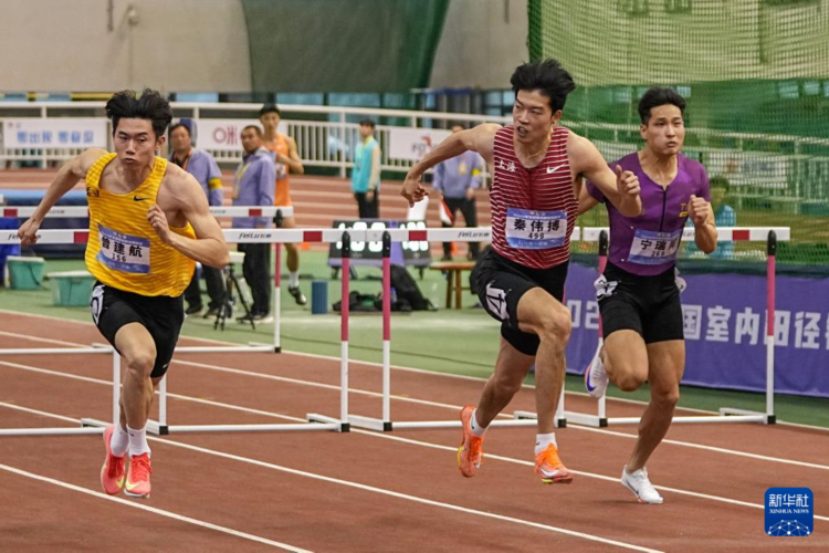 3月9日,上海隊選手秦偉搏(中)在男子60米欄決賽中。他以7秒56的成績獲得冠軍。 當日,2025年全國室內田徑錦標賽在山東濟南落幕。 新華社記者 朱崢 攝