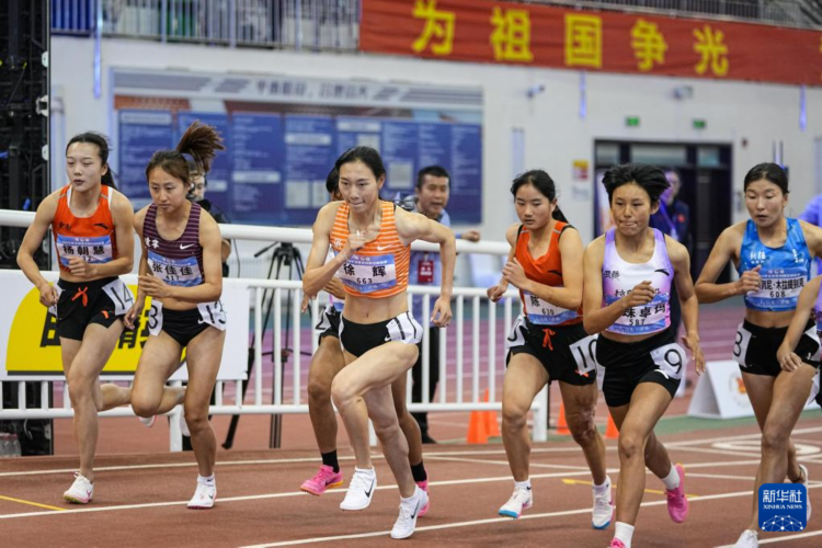 3月9日,浙江體彩隊選手徐輝(左三)在女子3000米決賽中。她以9分20秒99的成績獲得冠軍。 當日,2025年全國室內田徑錦標賽在山東濟南落幕。 新華社記者 朱崢 攝