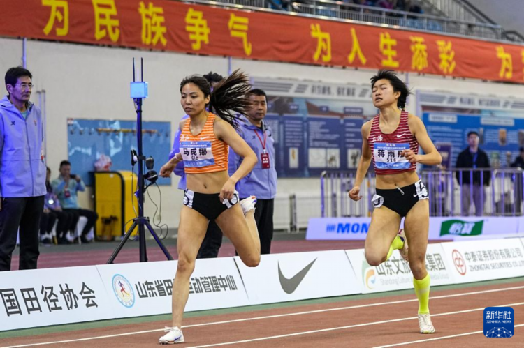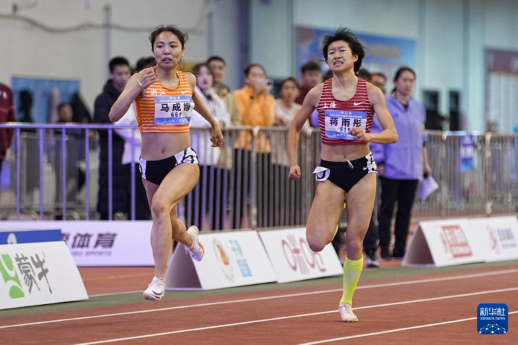 3月9日,浙江體彩隊選手馬成娜(左)在女子200米決賽中。她以24秒11的成績獲得冠軍。 當日,2025年全國室內田徑錦標賽在山東濟南落幕。 新華社記者 朱崢 攝