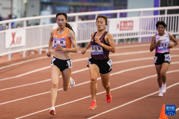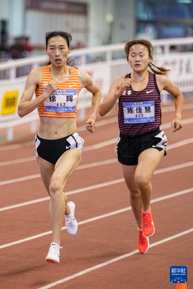 3月9日,浙江體彩隊選手徐輝(左)在女子3000米決賽中。她以9分20秒99的成績獲得冠軍。 當日,2025年全國室內田徑錦標賽在山東濟南落幕。 新華社記者 朱崢 攝