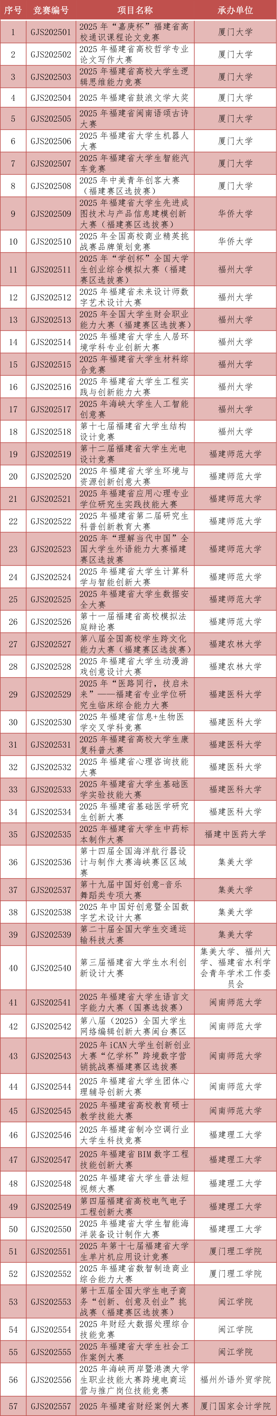 省教育廳日前公布福建省2025年大學(xué)生學(xué)科專業(yè)競賽項目目錄?!?025年‘嘉庚杯’福建省高校通識課程論文競賽”等57項競賽列為2025年省級大學(xué)生學(xué)科專業(yè)競賽項目。列入本年度學(xué)科專業(yè)競賽項目目錄的賽事,須于12月31日前完成。對未按要求規(guī)范辦賽、未按時報送競賽結(jié)果的項目,將不再列入下一年度省級學(xué)科專業(yè)競賽項目。 福建省2025年大學(xué)生學(xué)科專業(yè)競賽項目目錄