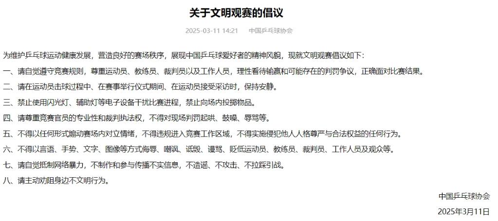 中國乒協表示,為維護乒乓球運動健康發展,營造良好的賽場秩序,展現中國乒乓球愛好者的精神風貌,特提出文明觀賽的倡議。 這八條倡議包括:請自覺遵守競賽規則,尊重運動員、教練員、裁判員以及工作人員,理性看待輸贏和可能存在的判罰爭議,正確面對比賽結果;請在運動員擊球過程中、在賽事舉行儀式期間、在運動員接受采訪時,保持安靜;禁止使用閃光燈、輔助燈等電子設備干擾比賽進程,禁止向場內投擲物品;請尊重競賽官員的專業性和裁判執法權,不得對現場判罰起哄、鼓噪、辱罵等;不得以任何形式煽動賽場內對立情緒,不得違規進入競賽工作區域,不得實施侵犯他人人格尊嚴與合法權益的任何行為;不得以言語、手勢、文字、圖像等方式侮辱、嘲諷、詆毀、謾罵、貶低運動員、教練員、裁判員、工作人員及觀眾等;請自覺抵制網絡暴力,不制作和參與傳播不實信息,不造謠、不攻擊、不拉踩引戰;請主動勸阻身邊不文明行為。 |