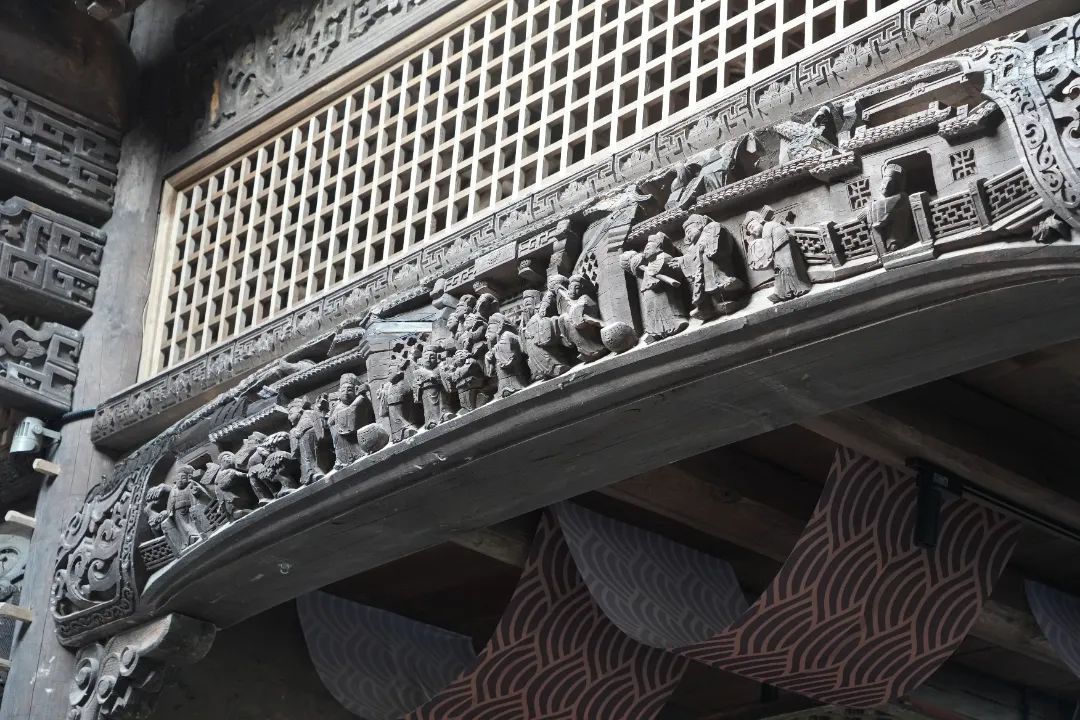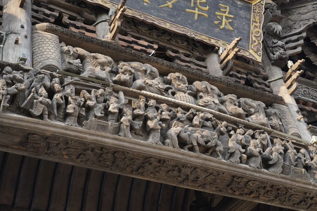 五鳳樓的柱子和梁架結(jié)構(gòu)采用梓木、柏木,雕花構(gòu)件則為樟木,材質(zhì)上乘,雕工極其精細(xì)。在古建筑中,人物是最難雕刻的。因為每一個人物都代表了一個典故傳說或者一段民間故事,因此就要求匠人在雕刻人物的時候,必須從衣著到表情都做到形神兼?zhèn)洹⑽┟钗┬?,才能讓人們一眼就能認(rèn)出其背后的故事。武夷·夢華錄五鳳門樓的橫梁,雕刻的是郭子儀拜壽的故事,生動展現(xiàn)了郭子儀與夫人同慶七十大壽的盛況。武夷·夢華錄里的這座五鳳樓,就雕刻了上百位的人物、數(shù)十個傳奇故事,這在中國古建筑中是非常罕見的。