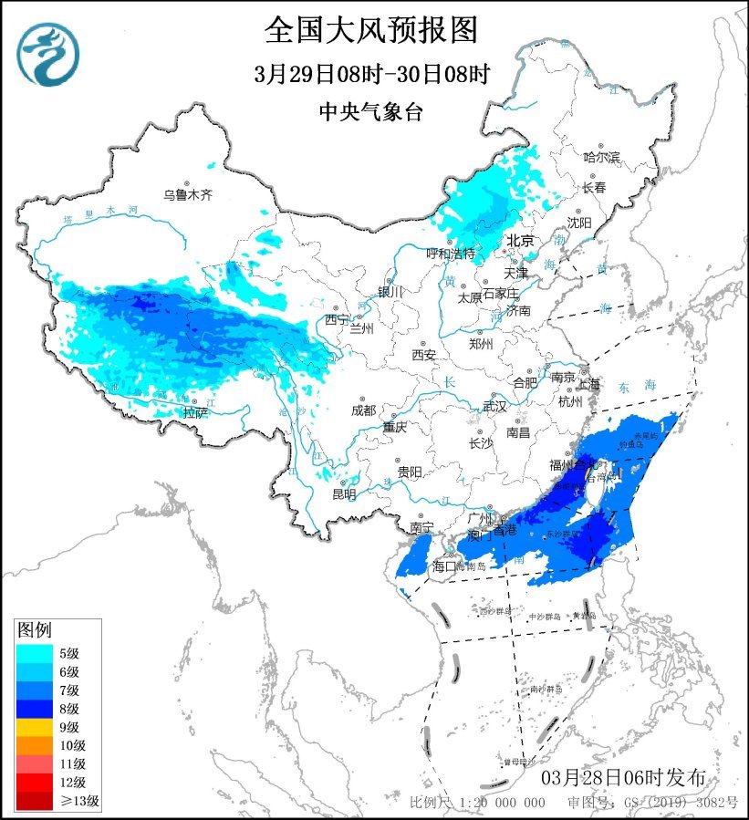 3月29日08時(shí)至30日08時(shí),新疆南疆、西藏中北部、青海西部、甘肅河西、內(nèi)蒙古中東部、華北北部等地的部分地區(qū)有5~6級(jí)風(fēng),陣風(fēng)可達(dá)7級(jí)及以上;東海南部海域、臺(tái)灣海峽、臺(tái)灣以東洋面、巴士海峽、南海北部海域、北部灣將有7~8級(jí)、陣風(fēng)9級(jí)的大風(fēng),其中臺(tái)灣海峽部分海域風(fēng)力可達(dá)9級(jí)、陣風(fēng)10級(jí)。
