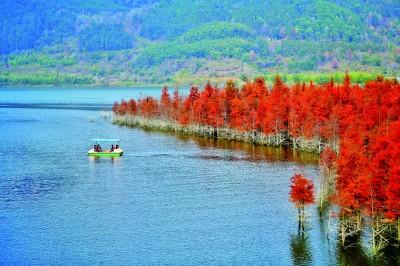 游客乘船穿行落羽杉林。金孝民攝/光明圖片