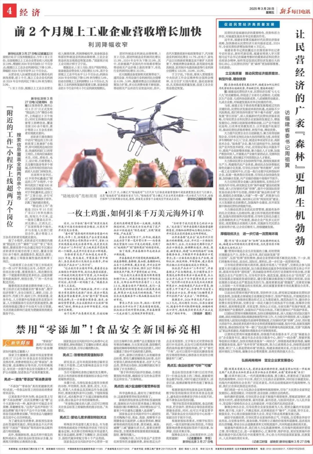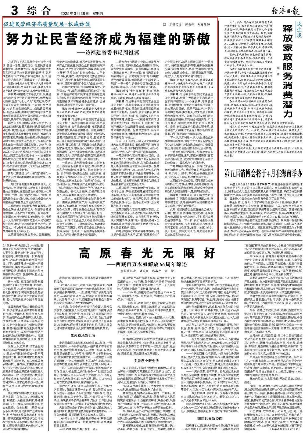 福建是民營經濟大省 新時代新征程 福建如何促進民營經濟 健康發展、高質量發展? 日前 福建省委書記周祖翼 分別接受了 人民日報、新華社 中央廣播電視總臺、經濟日報 專訪 一起來看詳情—— 人民日報 《人民日報》2025年3月28日03版 歷經多年發展,民營經濟已成為福建經濟的重要特色、優勢和活力所在,創造了全省約七成稅收、七成地區生產總值、七成科技創新成果、八成城鎮勞動就業、九成企業數量,具有舉足輕重的作用。新時代新征程,作為民營經濟大省,福建如何促進民營經濟健康發展、高質量發展?日前,福建省委書記周祖翼接受人民日報記者采訪,相關稿件于3月28日人民日報刊登,題為《加快建設新時代民營經濟強省》。詳情>>> 新華社 《新華每日電訊》2025年3月28日04版 民營經濟是福建經濟的重要特色、優勢和活力所在,對福建發展具有舉足輕重的作用。 近年來,福建省部署實施新時代民營經濟強省戰略,加快推動從民營經濟大省向強省邁進。2024年,全省民營經濟增加值突破4萬億元。 福建省委書記周祖翼近日在接受新華社記者專訪時表示,新時代新征程,福建省將深入學習貫徹習近平總書記在福建考察時的重要講話和民營企業座談會精神,始終堅定促進民營經濟發展壯大的信心決心,讓民營經濟的廣袤“森林”更加郁郁蔥蔥、生機勃勃。詳情>>> 中央廣播電視總臺 作為民營經濟大省,福建正全力推進新時代民營經濟強省戰略,下一步如何支持引導民營經濟打造新優勢、塑造新動能呢? 3月28日中央廣播電視總臺《新聞聯播》的系列報道《促進民營經濟高質量發展·權威訪談》,播出總臺記者對福建省委書記周祖翼的專訪。詳情>>> 經濟日報 《經濟日報》2025年3月28日03版 習近平總書記在民營企業座談會上強調,要統一思想、堅定信心,促進民營經濟健康發展、高質量發展。福建省如何貫徹落實好習近平總書記重要講話精神,縱深推進新時代民營經濟強省戰略?近日,經濟日報記者采訪了福建省委書記周祖翼。詳情>>> |