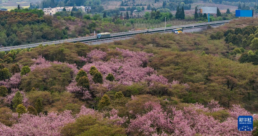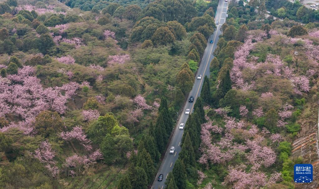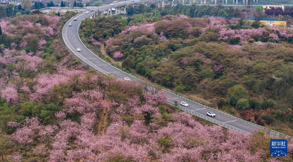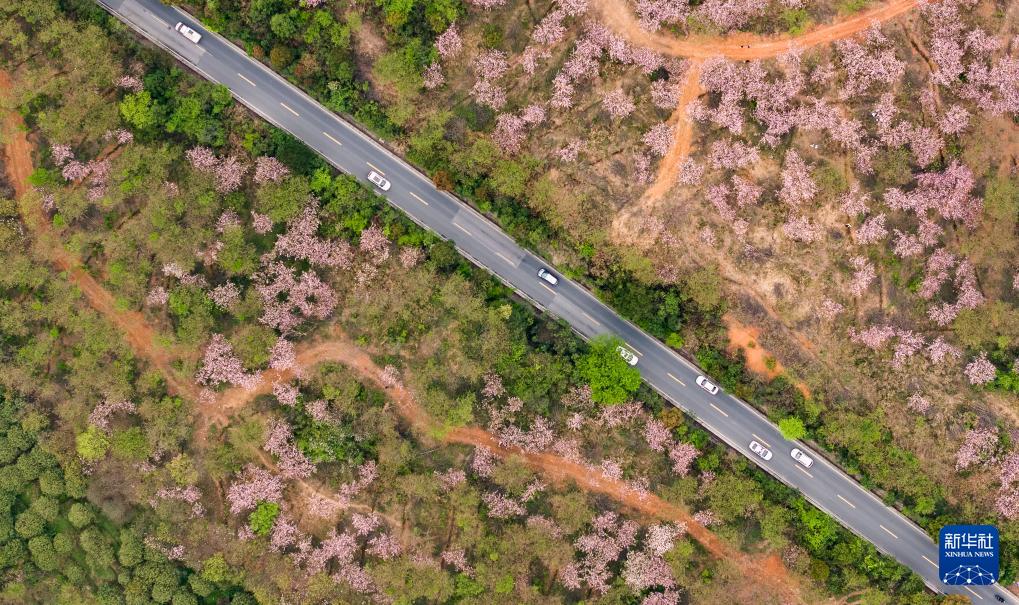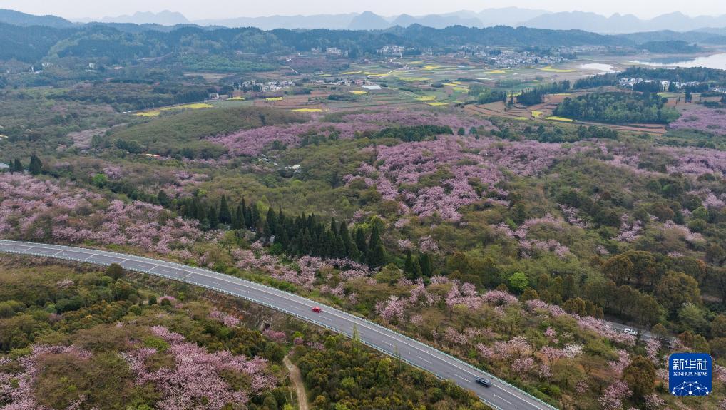 清鎮(zhèn)市紅楓湖鎮(zhèn)右二村旁的道路與花海相映(4月5日攝,無人機照片)。 清明時節(jié),貴州省貴陽市清鎮(zhèn)市紅楓湖鎮(zhèn)右二村公路旁的櫻花、海棠花競相綻放,道路與花海相映,人們驅(qū)車前來踏青游玩,感受美好春光。 新華社記者 陶亮 攝