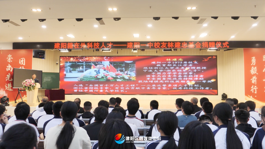 4月7日,建陽籍在外科技人才、建陽一中校友林建忠基金捐贈儀式暨個人專題報告會在建陽一中報告廳舉行。建陽一中校友林建忠及75屆一中校友代表袁思明、周景平、傅禮,副區長孫玉坤,區教育局、建陽一中相關負責人、師生代表參加儀式。