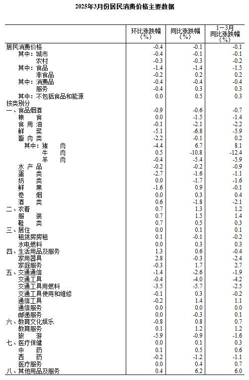2025年3月份,全國居民消費價格同比下降0.1%。其中,城市下降0.1%,農村下降0.3%;食品價格下降1.4%,非食品價格上漲0.2%;消費品價格下降0.4%,服務價格上漲0.3%。1—3月平均,全國居民消費價格比上年同期下降0.1%。 3月份,全國居民消費價格環比下降0.4%。其中,城市下降0.4%,農村下降0.3%;食品價格下降1.4%,非食品價格下降0.2%;消費品價格下降0.4%,服務價格下降0.4%。