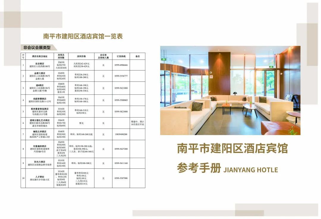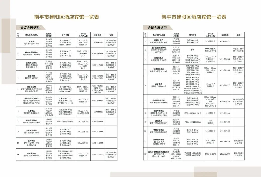 為積極響應南平市“迎賓客引人流”活動部署,建陽區以提升旅游服務品質為抓手,精心編制《南平市建陽區酒店賓館參考手冊》,現正式面向社會發布,為廣大游客及商務人士提供精準的住宿、辦會指引服務。