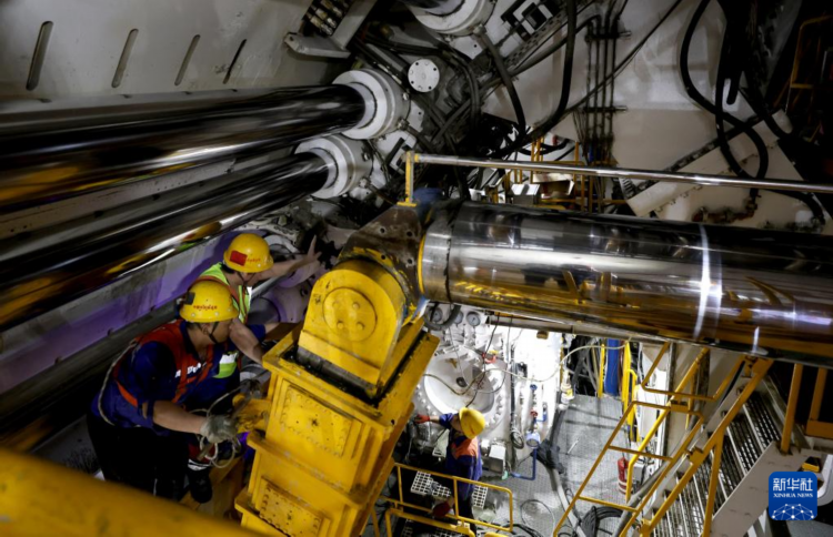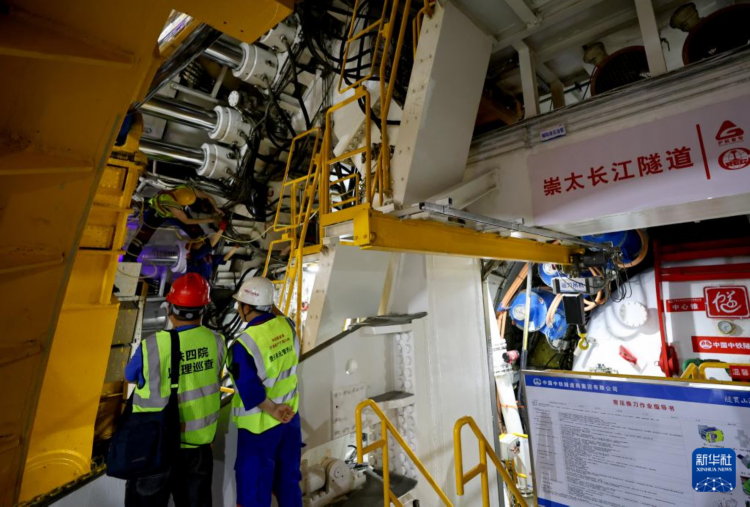 4月16日,技術工人在“領航號”盾構機刀盤后部進行施工作業。 新華社記者 方喆 攝