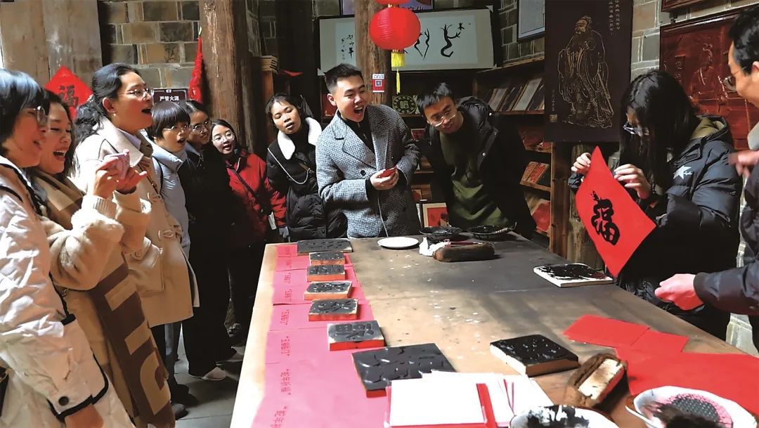 游客圍觀建本印刷技藝體驗。張威 攝 拓展“業”的邊界 深化“文”的體驗 “一直以來,建陽區實施‘文旅+’戰略,不斷拓展旅游產業鏈條,促進旅游與研學、體育、康養、農業、經濟等產業跨界融合,在考亭古韻、建本遺珍與田園詩意間繪就旅游新圖景。”建陽區旅游公司負責人介紹。 武夷夢華錄的沉浸式文化IP、考亭書院厚重的文化沉淀、建盞文創園“入窯一色,出窯萬彩”的燒制技藝……建陽區將歷史場景活化、理學文化傳承與傳統工藝體驗有機串聯,構成了考亭文旅綜合體。 書坊鄉則是以“千年建本”為文化原點,緊扣“以書為名、以書為民”目標,深挖“紅、墨、綠”三色資源,創新推出《覽百年紅色勝景 品千載墨韻書香》等精品研學課程,構建“政府引導+校企合作”的立體化的研學生態。 莒口鎮馬伏村的農旅融合實踐同樣亮眼,全省首個裸眼3D油菜花彩繪景觀在寒泉精舍入口處驚艷亮相,吸引著眾多游客前來打卡。花田中“書香建陽”四個大字與一旁的理學文化圣地——寒泉精舍遙相呼應,形成了“花海藏書香,屋中有墨韻”的獨特景致。 當傳統文化與現代業態深度相擁,山水人文便轉化為發展動能。考亭的傳統文脈、建本的千年墨香、油菜花田的歡聲笑語,正共同譜寫文旅融合的建陽篇章。