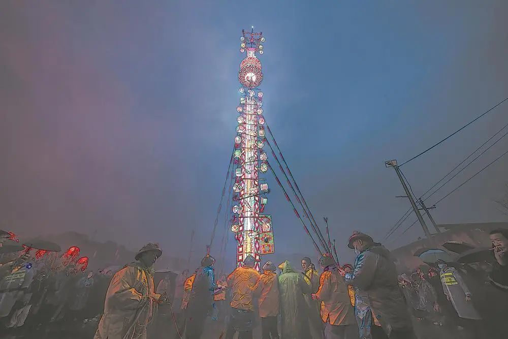 春意漸收,夏氣初萌。南平市建陽區彭墩村被晨霧籠罩,清代章氏民居的飛檐破霧而出,磚墻上,花卉與神獸的雕刻已然蘇醒,鏤空的窗欞線條流暢,透過簌簌日光。手藝人肖志鵬,此時正身姿后仰,高舉手機,將鏡頭穩穩對準天井上褪色的菱花紋。這些古建筑紋飾,將成為他明年設計高照燈紋樣的靈感。 今年2月22日,彭墩村因高照燈非遺民俗活動熱鬧非凡,近百名表演者組成的大型燈隊前擁后簇,長16.6米、重200公斤的高照燈由橫杠抬行,如長龍穿街走巷,一路踩街送福。夜幕落下,爆竹轟鳴,煙火騰空而起。隨著一聲哨響,由13組燈箱與3組旋轉頂燈疊成的高照燈緩緩豎起,側身掛著39盞花燈,如星星跳躍。雨水浸潤的燈紙透出五彩光暈,照亮了一方天地。 隨著舉燈人腳步輕挪,高照燈緩緩轉動,燈身正面豁然亮出“高照多接福,金蛇迎盛世”的祝語,瞬間點燃了人群的熱情,也照亮了非遺傳承的漫漫前路。