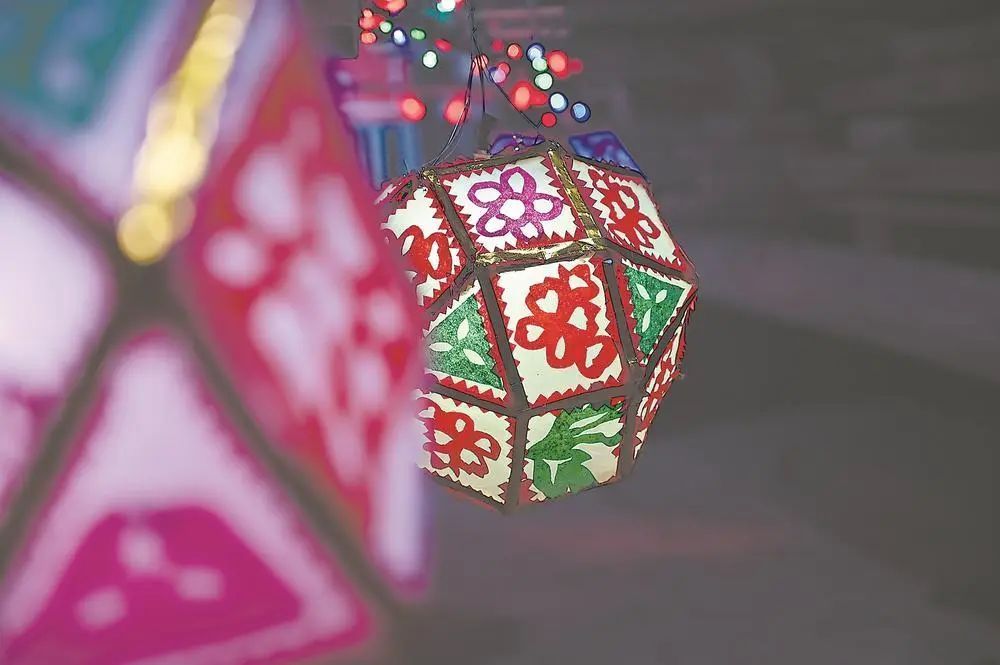 小花燈(黃慧聰 攝) 燈身與小花燈上剪貼的圖樣,多以彭墩村古建筑紋飾為藍本,經肖志鵬二次創作而成,圖案栩栩如生,靈動鮮活。