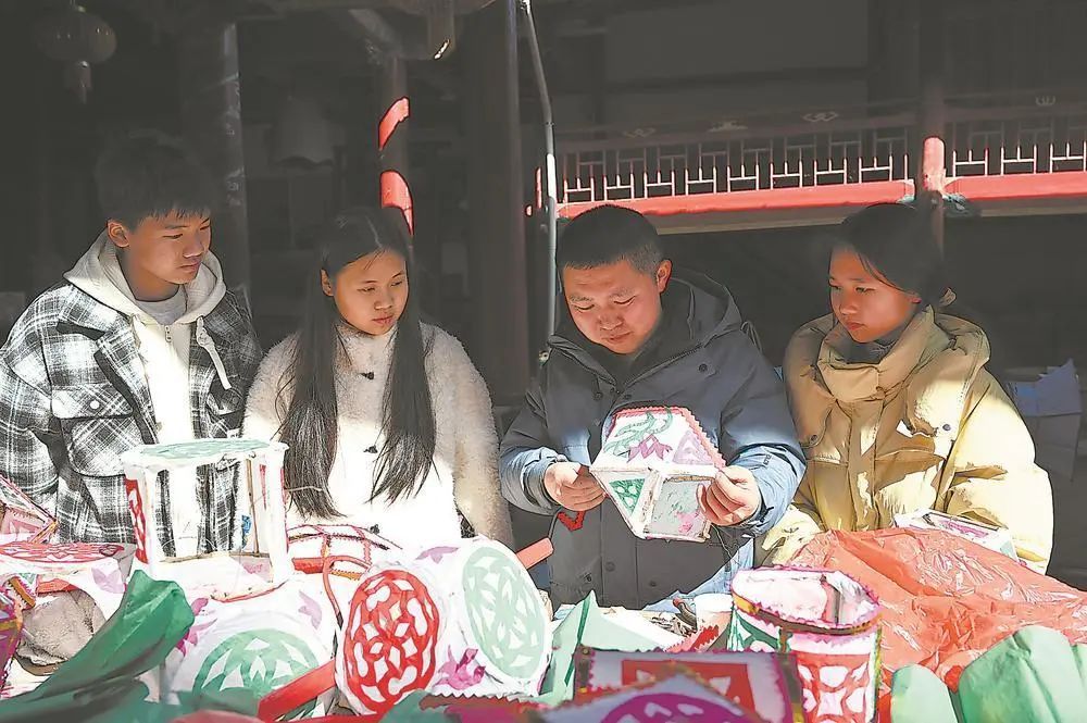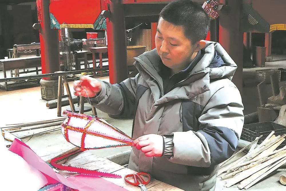 肖志鵬在制作小花燈。(王玥明 攝) 將高照燈元件一一組裝好,還不算完。高照燈是一整套表演體系,制作它的人,既要會工匠活,又得懂樂器,還得當導演,十八般武藝樣樣得通。 肖志鵬自幼跟著師傅們學習全套技藝。師傅們手把手教他敲鑼打鼓,節奏、力度要求嚴格。舉高照燈約需30人配合,或舉叉子,或持長度不一的竹竿,所有人須使力均衡、配合默契,稍有差錯,高照燈就會傾倒。肖志鵬翻出舉燈人練習的視頻——在眾人的驚呼聲中,高照燈轟然倒下,可見難度之大。 如今的高照燈,和過去相比有了不少變化。老藝人們出于安全考慮,將燭火改為彩燈。后來,肖志鵬把13組燈箱的透光孔由易碎的玻璃纖維換成金色紗網,既提升了表演安全性,又增強了燈光的折射效果。 肖志鵬坦言,目前僅在道光年間《建陽縣志》里尋到高照燈的文字記載。他解釋,師傅們多是樸實的老農民,記錄甚少。20世紀50年代初,建陽城關、將口、彭墩都曾有高照燈,可惜后來逐漸失傳。80年代末,彭墩村老藝人吳桂堂、章希濤帶領6位農友,憑著記憶成功趕制出高照燈,那時,他們都已六七十歲了。 1993年燈會前夕,6歲的肖志鵬在村口玩耍,被老藝人手中的活計深深吸引。記不清具體是哪天,他接過第一盞小花燈,開始為燈骨抹糨糊、貼金邊,從此踏上學藝之路。 2005年,18歲的肖志鵬挑起大梁,負責每年高照燈制作與燈隊表演指導。 “看,這個皇涼傘,是我師傅章希濤做的,他的字和我的完全不一樣。”肖志鵬說,章師傅已去世一二十年,具體年份都有些模糊了。 2018年,紀錄片《豎起燈塔迎吉祥——彭墩高照燈申報非遺項目紀實》中,時年88歲的吳桂堂在鏡頭前為肖志鵬“打下手”。他一會兒扶穩竹篾,一會兒遞去鉗子,眼神中滿是對徒弟的殷切期望。 尋后繼之光 去年,肖志鵬在《建陽區“高照燈及其扎糊技藝”代表性傳承人推薦表》“授徒傳藝”一欄,鄭重地填上了子女的名字,最小的孩子才10歲,就此立下傳承的“軍令狀”。 肖志鵬深知,僅靠自家孩子傳承遠遠不夠。每年燈會前,他都會在村里“抓壯丁”,吆喝鄉親幫忙,還將制作高照燈的步驟,以及打鼓、舉燈等配套表演的示范一一錄制在個人微信視頻號中。 采訪肖志鵬時,14歲的余佳、陳思媛和外村的同學正在給花燈貼金邊。 “高照燈是我們村的驕傲,每年燈會表演都特別震撼。今年是我們第一次參與制作,感覺可棒了!”余佳和陳思媛說,這39盞小小的花燈,為她們開啟了獨特的“非遺初體驗”。 相比其他非遺技藝,高照燈的“高”,反倒成了傳承路上的“攔路虎”。五層樓高的大家伙,既沒法像其他精巧的非遺制品一樣融入日常生活,也難以制成文創產品開拓市場。在肖志鵬心中,高照燈不只是個漂亮的大型工藝品,更是彭墩村數百年歷史的鮮活見證,承載著祖祖輩輩的情感與記憶。