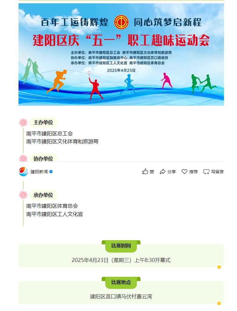 為慶祝中華全國總工會成立100周年,大力弘揚勞動精神、勞模精神和工匠精神,營造“勞動最光榮、勞動最崇高、勞動最偉大、勞動最美麗”的濃厚氛圍,展示我區職工隊伍積極向上的精神面貌,助力文旅產業賦能鄉村振興,落實“迎賓客引人流,促消費促發展”工作部署,乘著全省文旅經濟發展大會成功召開的東風,推介“八閩研學休閑第一村——馬伏”,經研究決定,由區總工會和區文旅局主辦的2025年慶 "五一"職工趣味運動會將于2025年4月23日(星期三)在莒口鎮馬伏村熹云灣歡樂開賽!