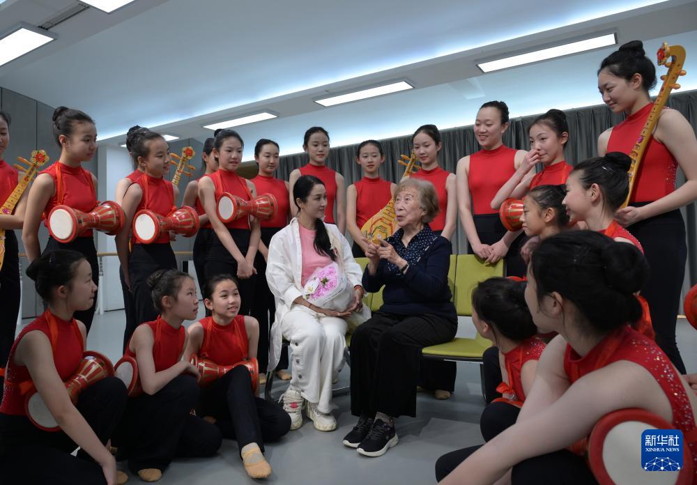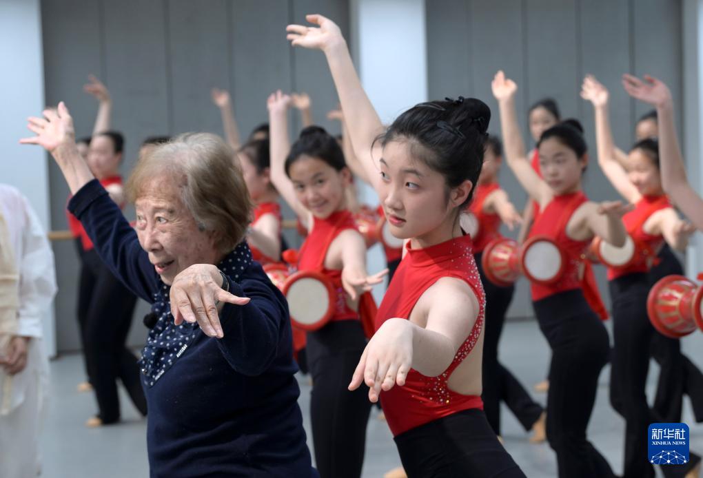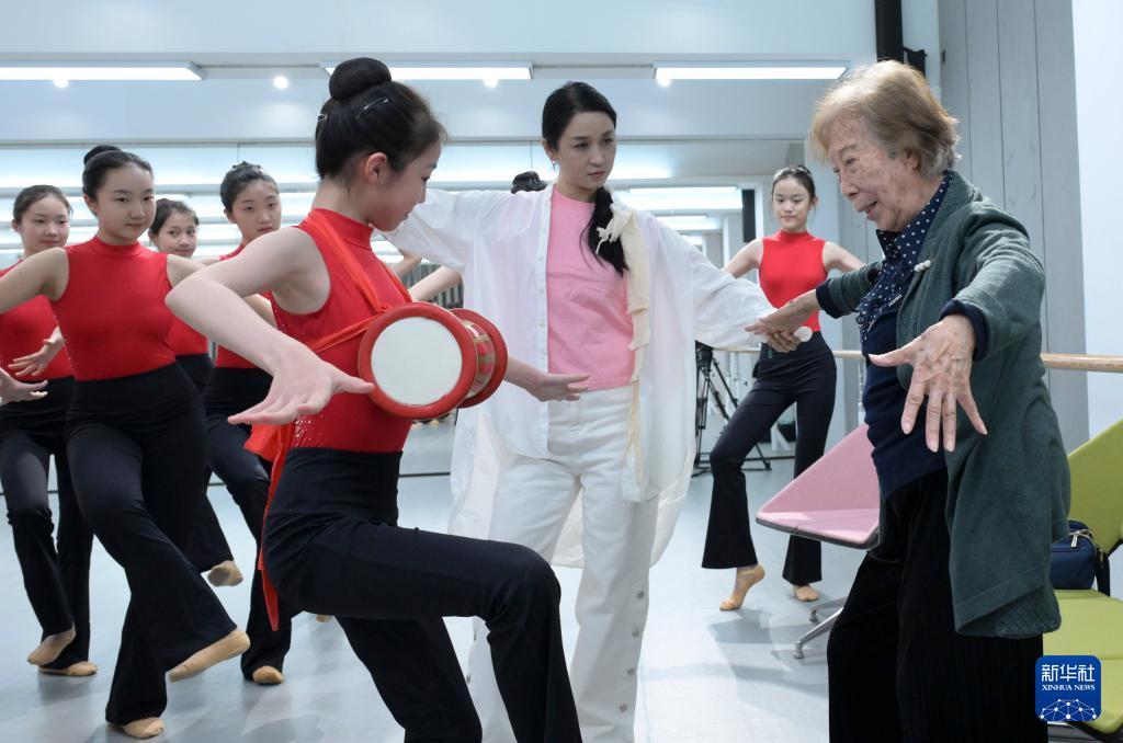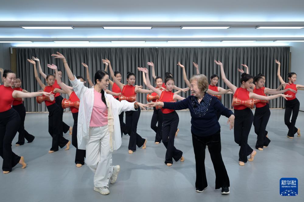 4月25日,高金榮(右一)為學生指點敦煌舞動作要領。 當日,敦煌舞教學體系創始人、2024年“最美教師”高金榮走進北京師范大學附屬中學,為金帆舞蹈團的學生們進行敦煌舞指導。在授課過程中,高金榮老師不僅傳授了專業的舞蹈技巧,還分享了敦煌舞背后的歷史文化底蘊。 新華社記者 金良快 攝