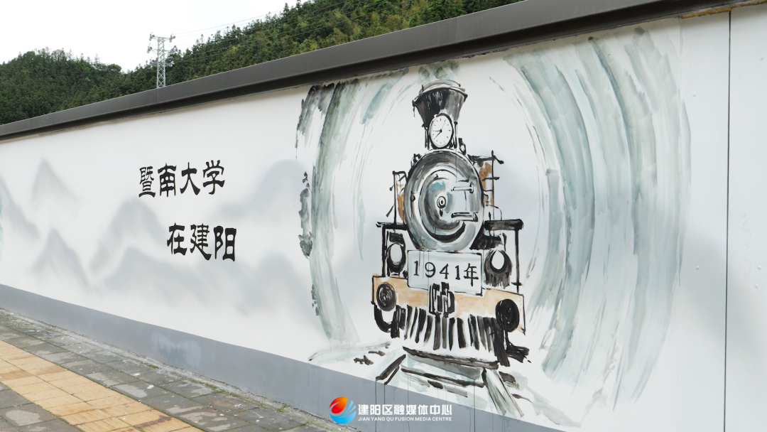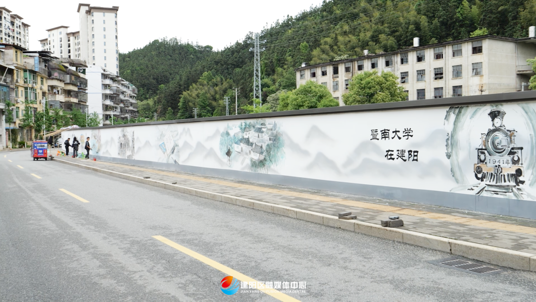 1941年6月的抗戰(zhàn)時(shí)期,在上海辦學(xué)的暨南大學(xué)到建陽的設(shè)立分校,次年全校遷入建陽,抗戰(zhàn)勝利后的1946年4月回遷上海。暨大在建陽立校約5年,使當(dāng)時(shí)的建陽頓時(shí)成為東南地區(qū)首屈一指的“文化城”。為了更好地再現(xiàn)這段光輝歲月,墻畫在參考?xì)v史資料、老照片的基礎(chǔ)上進(jìn)行創(chuàng)作、繪制。
