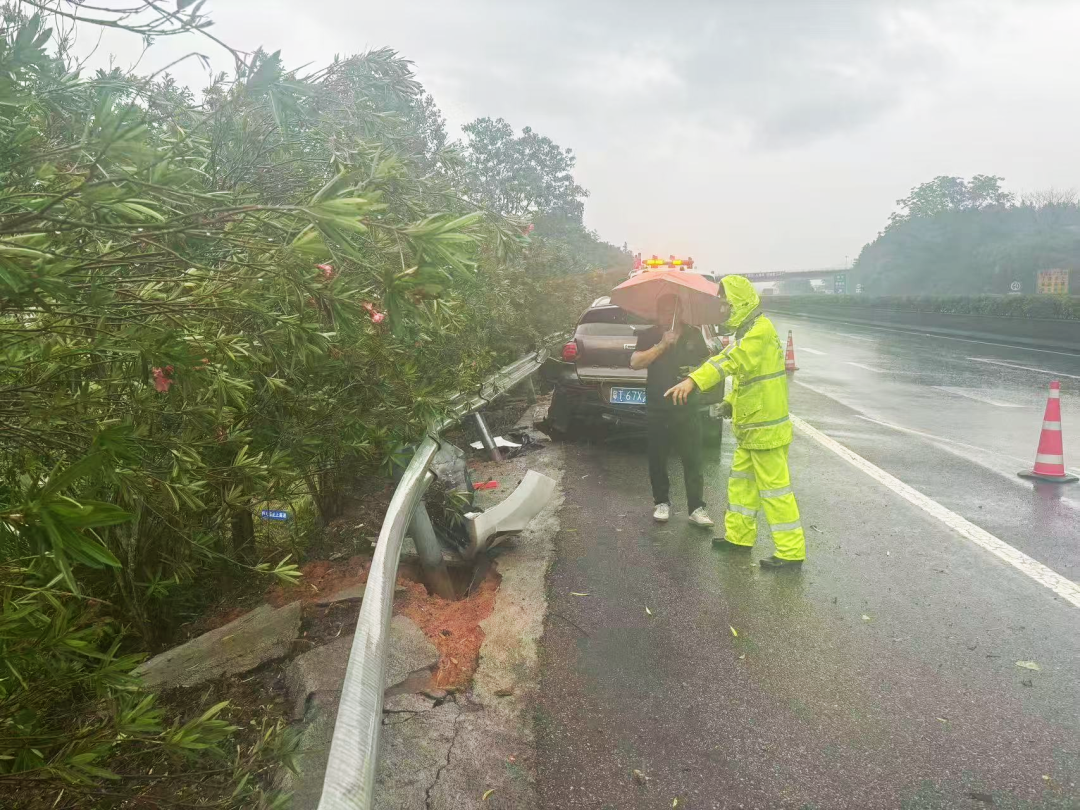 五一假期接近尾聲,高速公路返程高峰已經到來,且南平地區連續大雨天氣,增加了車輛在高速公路發生事故的可能性。5月5日上午9點30分,南平高速執法支隊四大隊接到事故報警,在京臺高速A道南臺服務區出口附近,發生小型轎車單方事故,該事故造成高速公路路產損失和1人員受傷,要求前往處置。