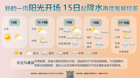 本周前期 全省大部沒有雨水打擾 適宜進行戶外活動或晾曬 15日起降水將再次發展增多 建議朋友們關注降水和低能見度天氣 對交通安全的不利影響 氣溫方面 隨著陰雨減少,天空放晴 在副熱帶高壓掌控下 輻射升溫明顯 新的一周 福建地區氣溫步入上升通道 夏意漸濃 最高氣溫在30℃以上的區域 都將明顯增多 朋友們出行注意防曬