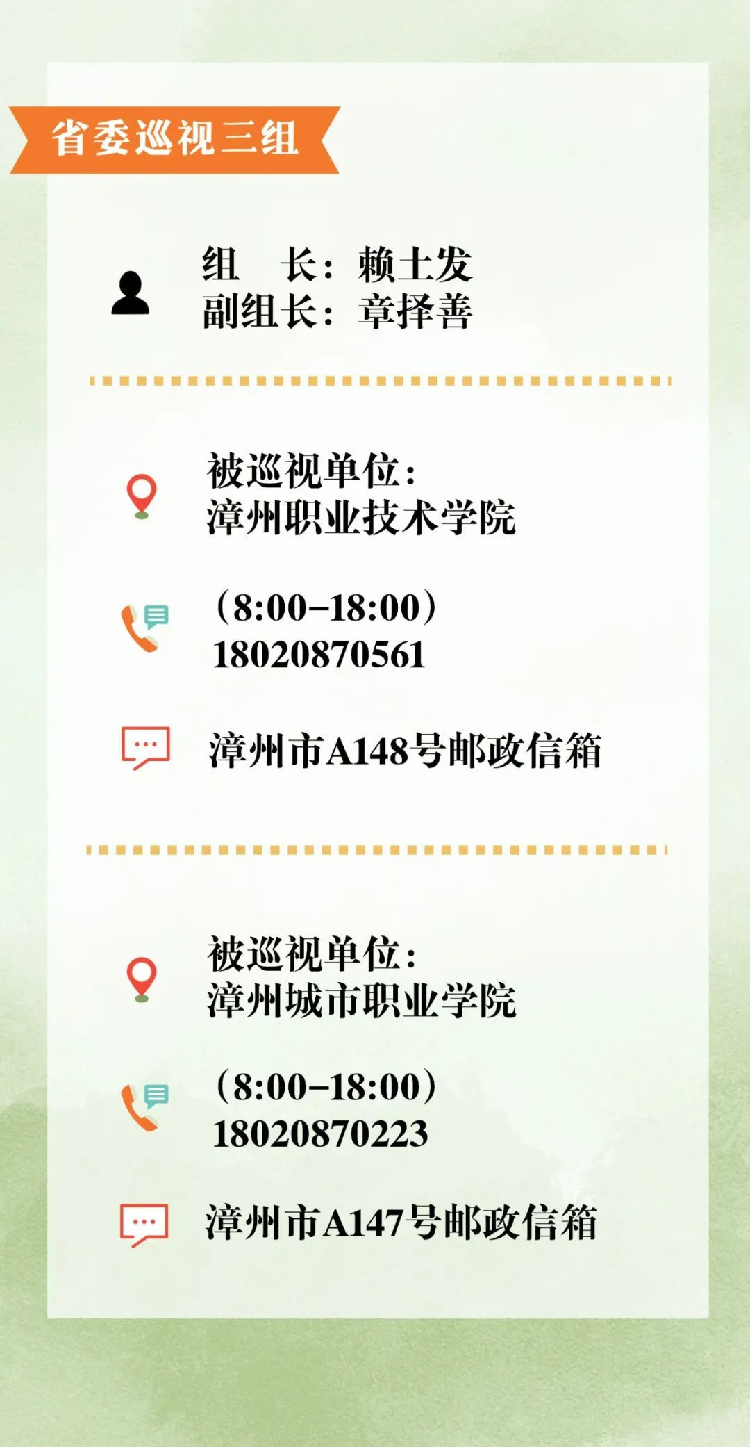 巡視工作時間40天左右。其間設立專門值班電話和郵政信箱,主要受理反映被巡視黨組織領導班子及其成員、下一級主要負責人、重要崗位領導干部問題的來信來電來訪,重點是關于違反政治紀律、組織紀律、廉潔紀律、群眾紀律、工作紀律和生活紀律等方面的舉報和反映。其他不屬于巡視受理范圍的信訪問題,將按規定由有關部門認真處理。 |