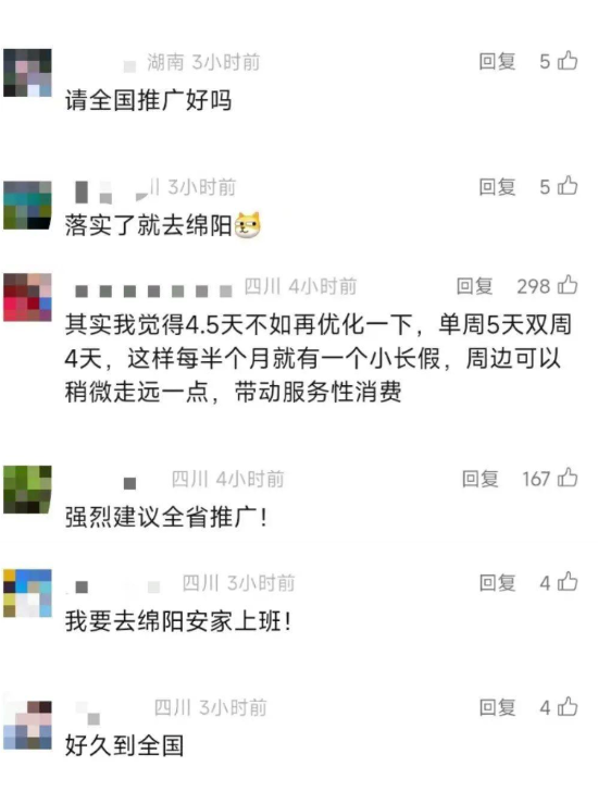 △《綿陽市提振消費專項行動2025年工作清單》 5月24日,記者致電綿陽市政府值班室,工作人員表示沒有接到相關通知。記者隨后聯系到綿陽市商務局,該局工作人員介紹,相關文件中寫的是鼓勵有條件的地區實行4.5天彈性工作制度,但并非強制要求。 對此,不少網友表示建議在全國推廣。