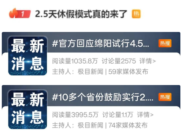 近日 四川綿陽宣布 試行4.5天彈性工作制 鼓勵2.5天休假模式 相關話題沖上社交平臺熱搜第一