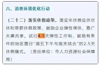 四川綿陽官宣試行4.5天彈性工作制 官方回應:并非強制 近日,四川省綿陽市商務局印發《綿陽市提振消費專項行動2025年工作清單》,旨在全面提升居民消費能力和市場活力。 《工作清單》提出開展七大核心行動,包含29條具體措施,涵蓋了收入、教育、養老、住房、賽事、夜經濟、休假等多個方面。備受關注的落實休假政策中提到,落實年休假應休盡休和帶薪休假政策,鼓勵企業彈性調休,推廣夫妻共享。試行4.5天彈性工作制,鼓勵有條件的地區推行“周五下午與周末結合”的2.5天休假模式。