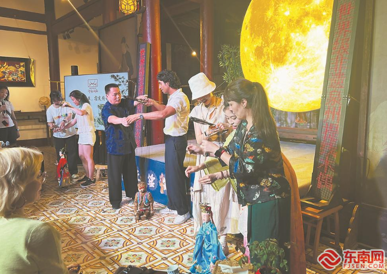 參加“外國專家福建行”的外國友人體驗木偶戲技藝。福建日報記者 湯海波 攝