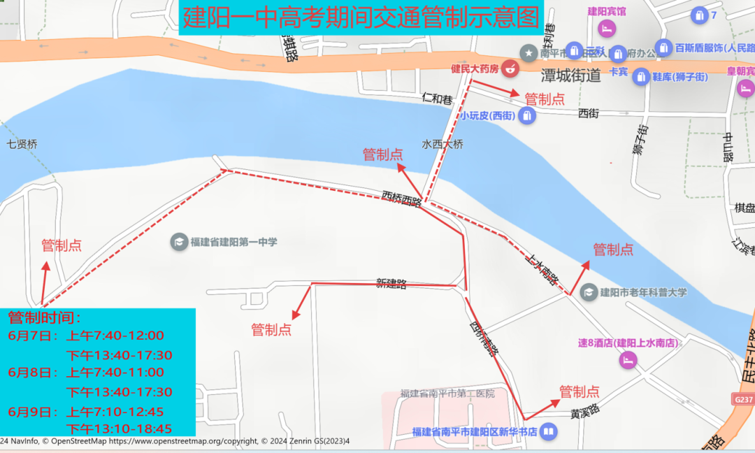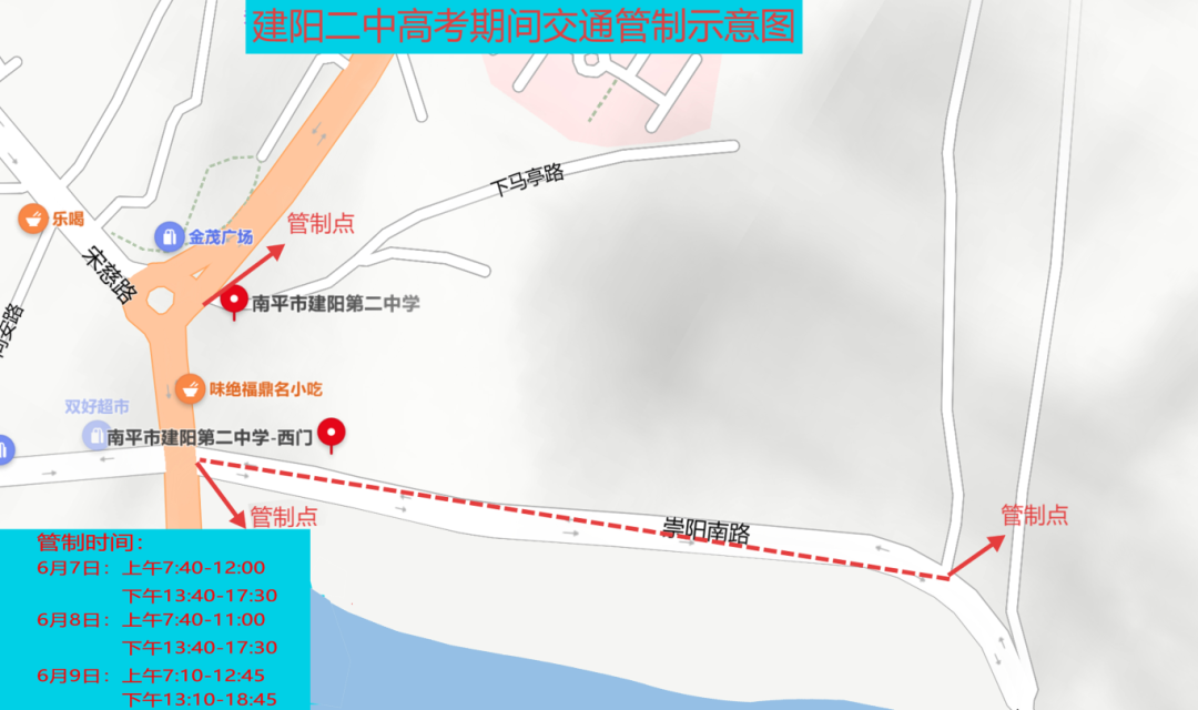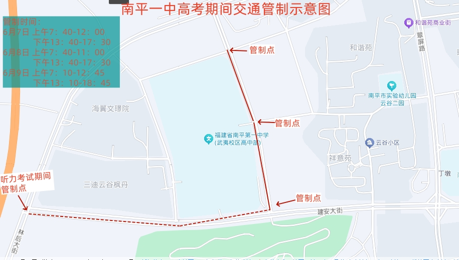 廣大市民朋友們: 為確保2025年我區高考平安順利,為考生提供良好的考試環境,南平市建陽區招生委員會和南平市公安局交通警察支隊建陽大隊特向我區廣大市民朋友們作如下溫馨提示,請廣大市民予以配合支持。 一、2025年普通高考將于6月7—9日在建陽一中、建陽二中、南平一中武夷校區高中部進行。請廣大市民自覺維護好考點周邊環境,考試期間周邊住宅區居民請勿大聲喧嘩,電視與音響不得大聲播放,考點周邊車輛禁止鳴喇叭,禁止燃放煙花爆竹等。 二、部分區域將實行交通管制。 1.建陽一中、建陽二中、南平一中武夷校區高中部考點周邊將實行交通管制。 (1)建陽一中考點交通管制路段:西橋南路(水西橋南端至人民保險公司)、新建路(農業局門口至西橋南路三叉路口),考試期間禁止車輛通行。西橋西路(住建局門口至建陽一中北門口)、上水南路(水西橋南側至文化館),外語聽力考試期間禁止機動車通行。 (2)建陽二中考點交通管制路段:崇陽南路(水東橋頭至昌盛路口),外語聽力考試期間禁止車輛通行,其余考試期間禁止大型車輛通行。 (3)南平一中武夷校區高中部考點交通管制路段:立德路(府后街路口至建安大街路口),外語聽力考試期間增加建安大街(立德路口至林后大街路口)。 2.交通管制時間: 6月7日 上午7:40—12:00 下午13:40—17:30 6月8日 上午7:40—12:00 下午13:40—17:30 (外語聽力考試時間14:40—15:30,期間禁止機動車輛通行) 6月9日 上午7:10—12:45 下午13:10—18:45 3.根據考務需要和考點周邊交通流量情況,采取臨時交通管制措施,請避開考點管制路段,服從現場交警指揮。 4.為保證考點周邊交通秩序井然,防止人群聚集造成交通擁堵,今年送考生到建陽一中、建陽二中考點、南平一中武夷校區高中部考點的家長或親友均不得進入交通管制線內,接送考生車輛即停即走,請考生家長和親友予以配合支持。 建陽交警溫馨提示:建陽交警在考點及附近路段部署了警力和警車,巡邏防范、疏導交通、為丟失或未帶證件等遭遇緊急情況的考生提供應急服務,考生如遇緊急情況,請第一時間聯系就近的執勤交警,我們將給予幫助。 附:考試期間交通管制示意圖 南平市建陽區招生委員會 南平市公安局交通警察支隊建陽大隊 2025年6月3日