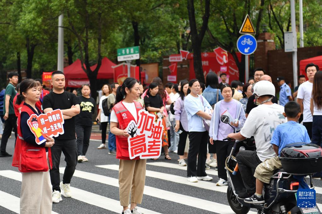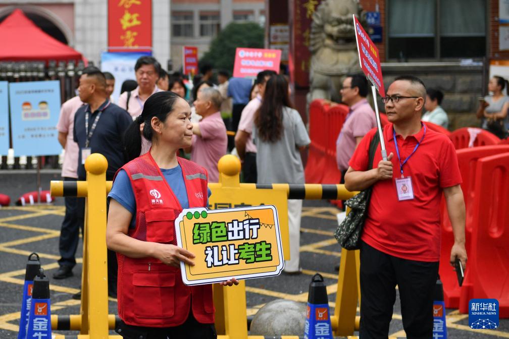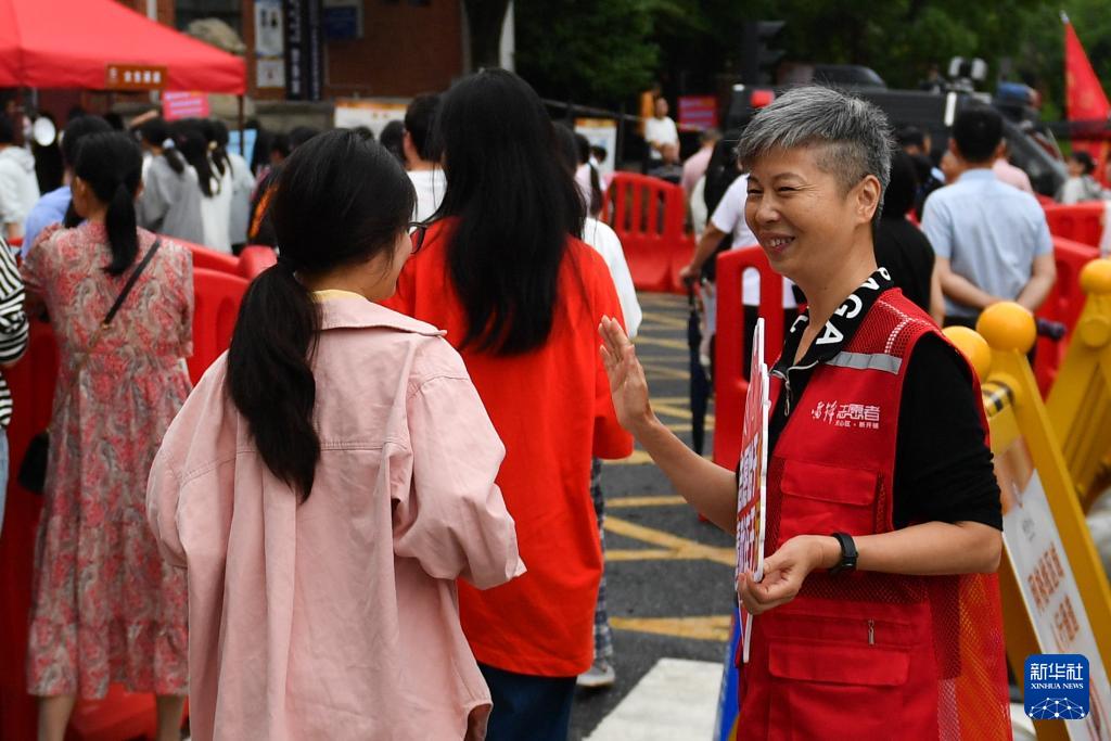 6月8日,志愿者在湖南省天心考區明德中學考點外維持秩序。 2025年全國高考期間,長沙市天心區組織青年志愿者,在多個考點為考生和家長提供便利服務。 新華社記者 陳振?!z