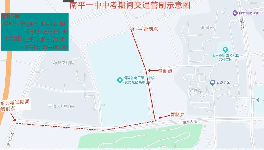 市民朋友們: 為確保2025年我區中考平安順利,為考生提供良好的考試環境,南平市建陽區招生委員會和南平市公安局交通警察支隊建陽大隊特向我區廣大市民朋友們作如下溫馨提示,請廣大市民予以配合支持。 一、2025年中考將于6月19—21日在建陽一中、建陽二中、南平一中武夷校區高中部進行。請廣大市民自覺維護好考點周邊環境,考試期間周邊住宅區居民請勿大聲喧嘩,電視與音響不得大聲播放,考點周邊車輛禁止鳴喇叭,禁止燃放煙花爆竹等。 二、部分區域將實行交通管制。 1.建陽一中、建陽二中、南平一中武夷校區高中部考點周邊將實行交通管制。 (1)建陽一中考點交通管制路段:西橋南路(水西橋南端至人民保險公司)、新建路(農業局門口至西橋南路三叉路口),考試期間禁止車輛通行。西橋西路(住建局門口至建陽一中北門口)、上水南路(水西橋南側至文化館),外語聽力考試期間禁止機動車通行。 (2)建陽二中考點交通管制路段:崇陽南路(水東橋頭至昌盛路口),外語聽力考試期間禁止車輛通行,其余考試期間禁止大型車輛通行。 (3)南平一中武夷校區高中部考點交通管制路段:立德路(府后街路口至建安大街路口),外語聽力考試期間增加建安大街(立德路口至林后大街路口)。 2.交通管制時間: 1、6月19—20日上午7:00—12:00,下午13:20—17:30; (20日下午外語聽力考試時間14:40—15:20,期間禁止一切機動車輛通行) 2、6月21日上午7:00—12:30,下午13:20—18:30; 3.根據考務需要和考點周邊交通流量情況,采取臨時交通管制措施,請避開考點管制路段,服從現場交警指揮。 4.為保證考點周邊交通秩序井然,防止人群聚集造成交通擁堵,今年送考生到建陽一中、建陽二中考點、南平一中武夷校區高中部考點的家長或親友均不得進入交通管制線內,接送考生車輛即停即走,請考生家長和親友予以配合支持。 建陽交警溫馨提示:建陽交警在考點及附近路段部署了警力和警車,巡邏防范、疏導交通、為丟失或未帶證件等遭遇緊急情況的考生提供應急服務,考生如遇緊急情況,請第一時間聯系就近的執勤交警,我們將給予幫助。 附:考試期間交通管制示意圖 南平市建陽區招生委員會 南平市公安局交通警察支隊建陽大隊 2025年6月13日