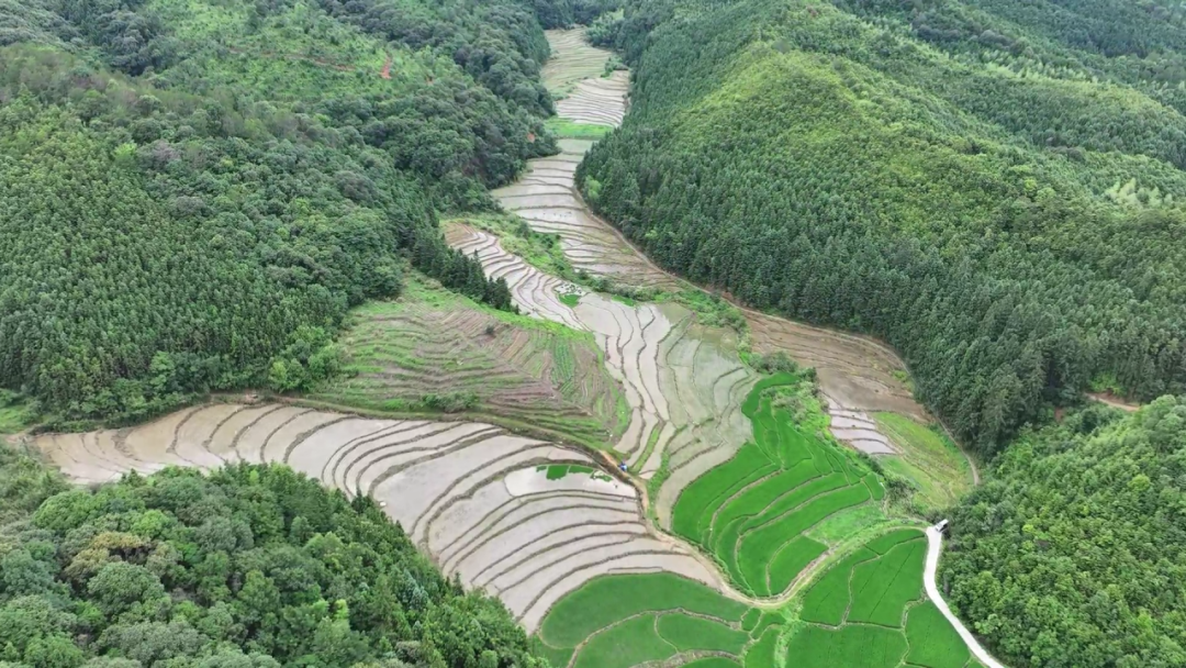 近日,在建陽區崇泰街道彭墩村布下自然村的山壟間,農戶們搶抓農時,挽起褲腿、俯身彎腰,在層層疊疊的山壟田里緊張有序地進行粳稻插秧作業,點點青翠的秧苗為山壟披上充滿希望的新綠,預示著豐收的前景。