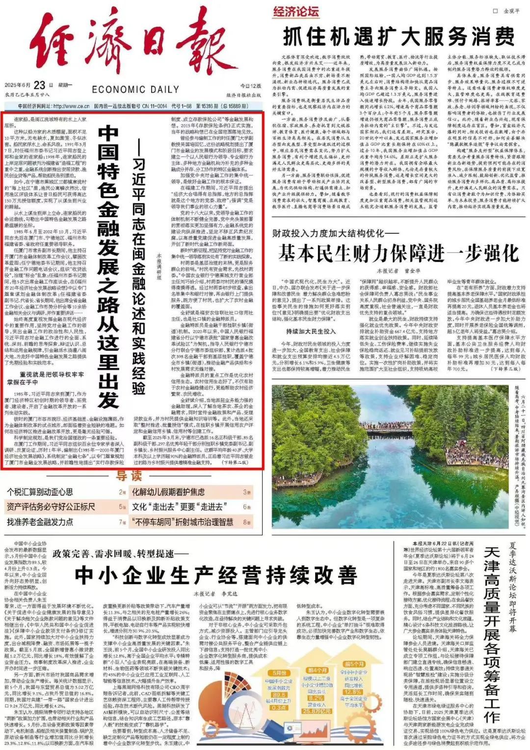 《人民日報》2025年6月24日第01版 金融,現代經濟的核心,國民經濟的血脈。 從2019年2月中央政治局集體學習時首次提出“走出中國特色金融發展之路”,到2023年10月中央金融工作會議上首次明確金融強國的建設目標,習近平經濟思想的金融篇日益豐富完善。 參天之木有其根,懷山之水有其源。 1985年6月至2002年10月,習近平同志在福建工作17年半,對金融工作做出了一系列極具前瞻性、開創性、戰略性的理念創新和實踐探索,為開拓中國特色金融發展之路提供了源頭活水和重要指導。詳情>> 新華社 6月19日,《新華全媒頭條》刊發《為有源頭活水來——習近平同志在閩金融論述與實踐啟示》。 福建是習近平新時代中國特色社會主義思想的重要孕育地之一。 習近平同志在福建工作17年半,領導和推動了地方改革開放和現代化建設事業,對金融領域的一系列重大命題進行了深入研究、長遠謀劃和有益探索,形成了大量原創性理念,開創了多項變革性實踐,取得了一系列標志性成果,為開拓中國特色金融發展之路提供了理論與實踐的源頭活水。 站在新的歷史起點上,在以習近平同志為核心的黨中央堅強領導下,我們堅定不移走中國特色金融發展之路,金融血脈將持續為中國經濟社會發展注入澎湃動力,為以中國式現代化全面推進強國建設、民族復興偉業提供有力支撐。詳情>> 6月19日,新華社國家高端智庫19日面向全球發布《中國特色金融發展之路的源頭活水與價值啟示——溯源習近平同志在閩金融論述與實踐》報告,對習近平同志探索中國特色金融發展道路的實踐經驗及其世界意義進行全面回顧、總結。