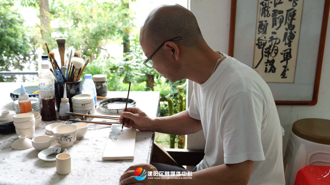 6月24日,走進位于考亭村的牧瓷苑手繪青花工作室,魏祖強正專注地在素坯上進行手繪,筆觸細膩流暢。