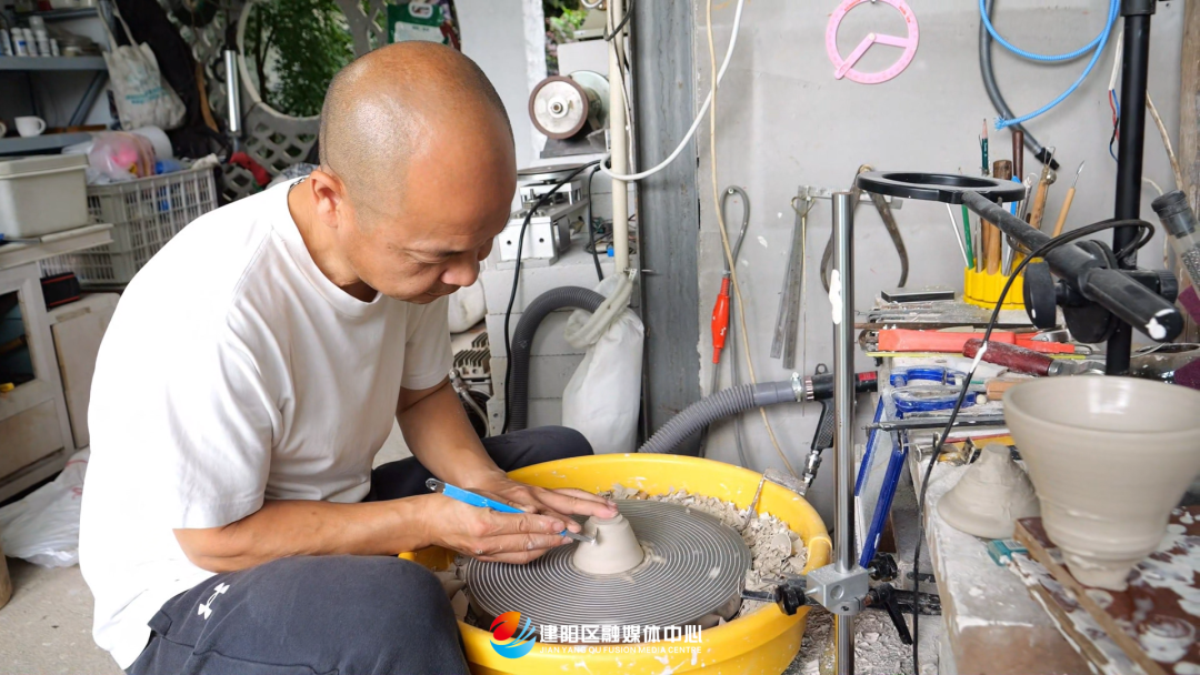 青瓷燒制技藝區級代表性傳承人魏祖強:“我現在很多工具是自己去改進的,改進完以后,發現整個生產速度,還有制作的精度都更高,然后表現你想要的東西,工具可以助你一臂之力、事半功倍,傳統的做法就不適合現代這么快節奏,所以從工具這塊要去不斷地改進。”
