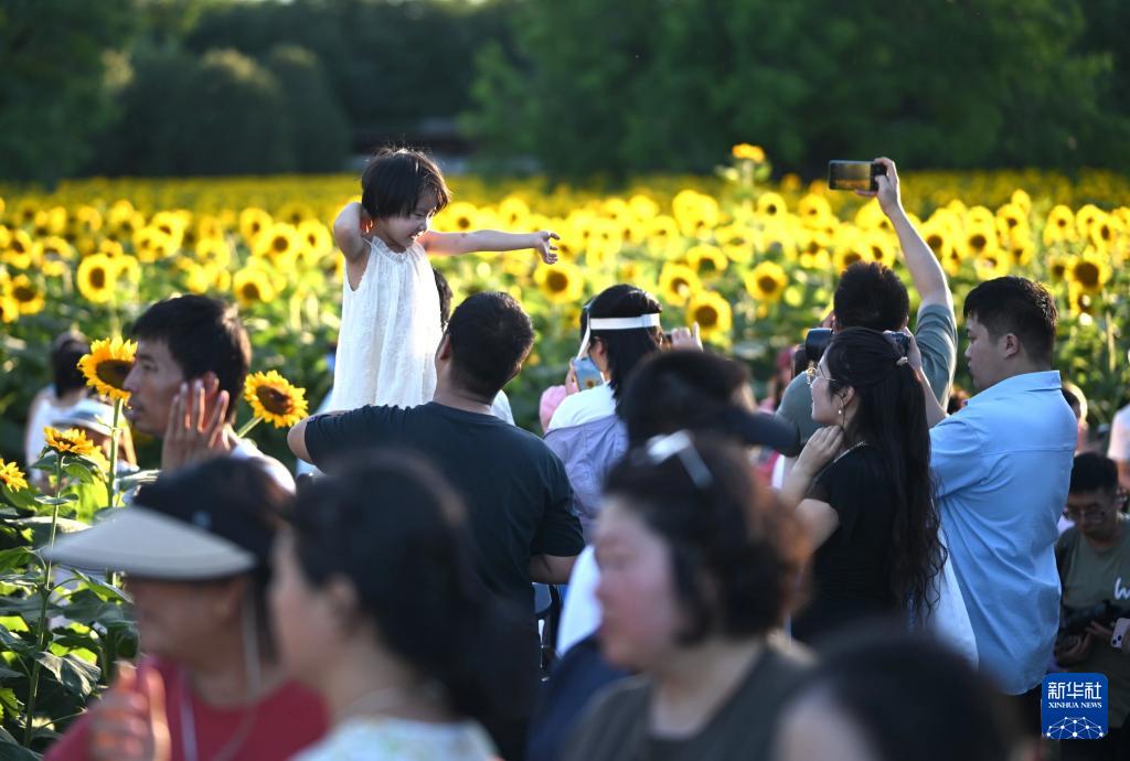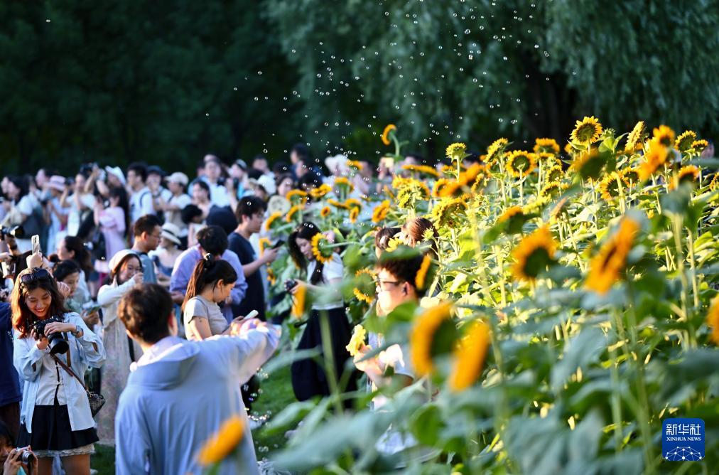 7月5日,游客在北京奧林匹克森林公園北園觀賞盛開的向日葵。 盛夏時節(jié),北京奧林匹克森林公園北園的向日葵迎來最佳觀賞期,吸引眾多市民游客前來觀賞。 新華社記者 陳曄華 攝