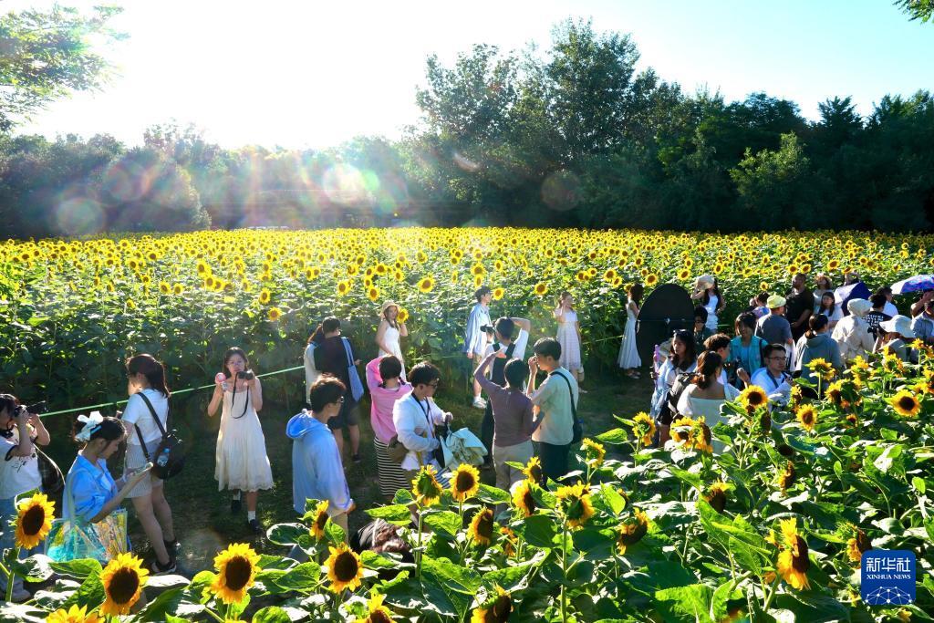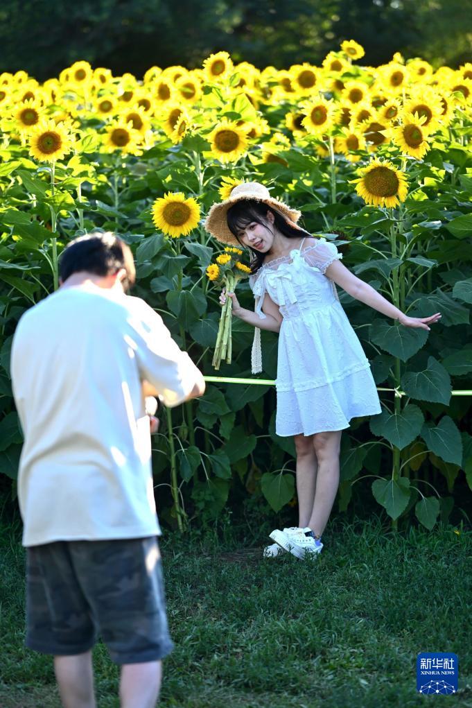 7月5日,游客在北京奧林匹克森林公園北園的向日葵花田中留影。 盛夏時節(jié),北京奧林匹克森林公園北園的向日葵迎來最佳觀賞期,吸引眾多市民游客前來觀賞。 新華社記者 陳曄華 攝