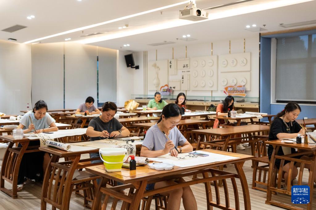 7月9日,在湖南湘江新區(qū)文化館,學(xué)員在練習(xí)書法。 今年4月以來,湖南湘江新區(qū)文化館聚焦群眾對文化藝術(shù)的多元需求,開展“星光夜?!狈?wù)項(xiàng)目,設(shè)置樂器演奏、舞蹈等多種課程,滿足不同學(xué)藝需求。 新華社記者 陳思汗 攝 |